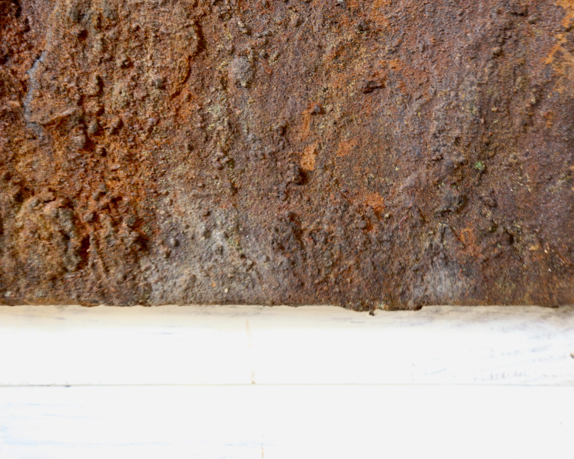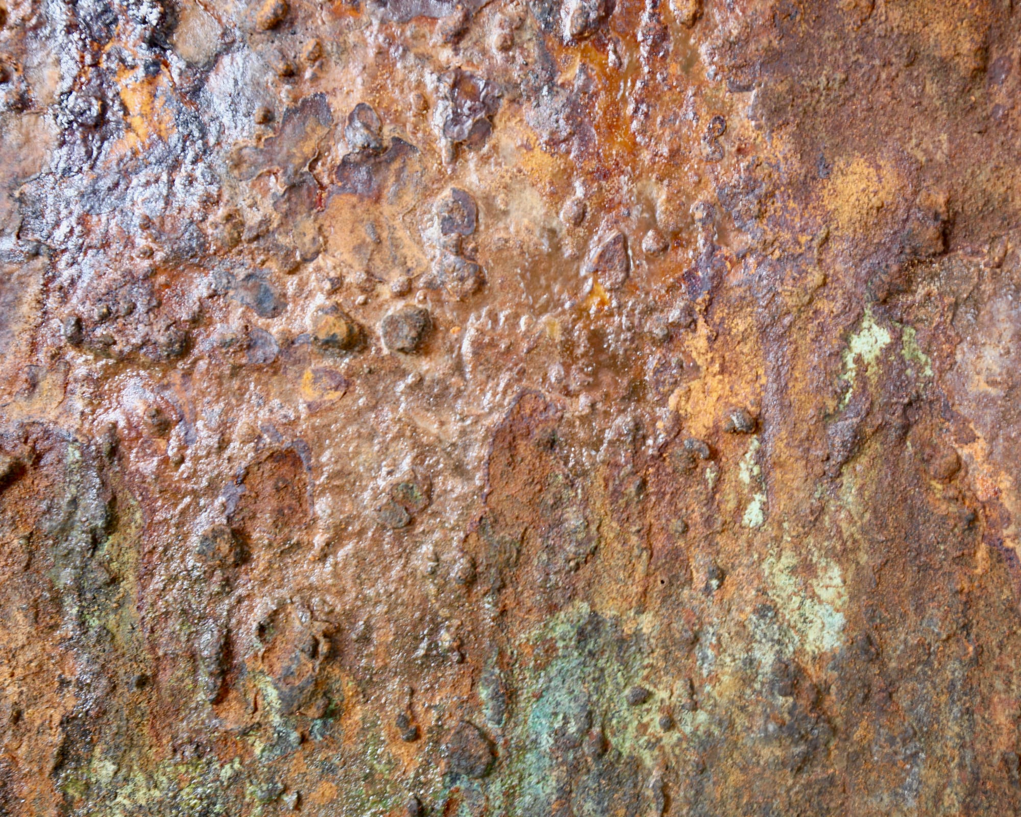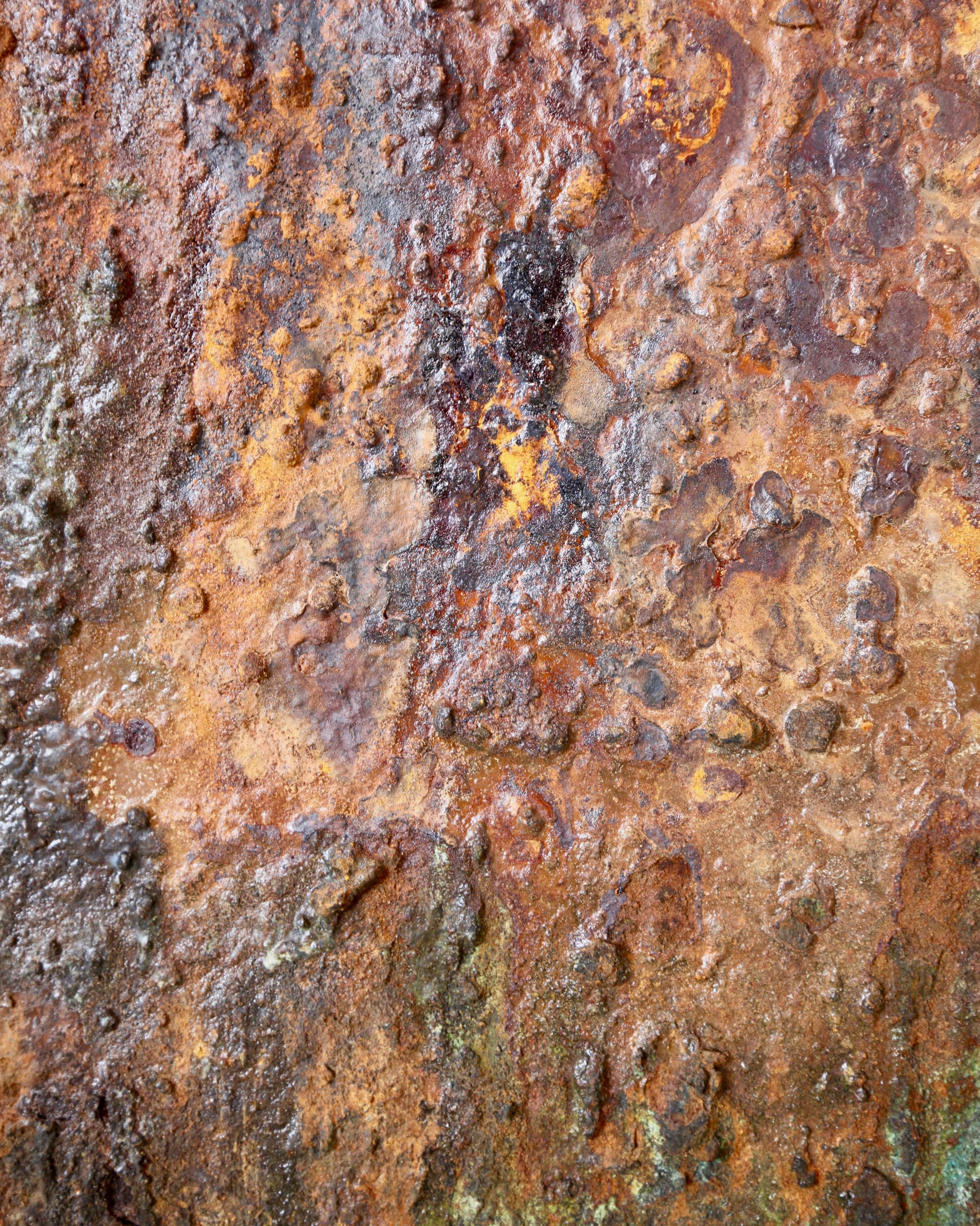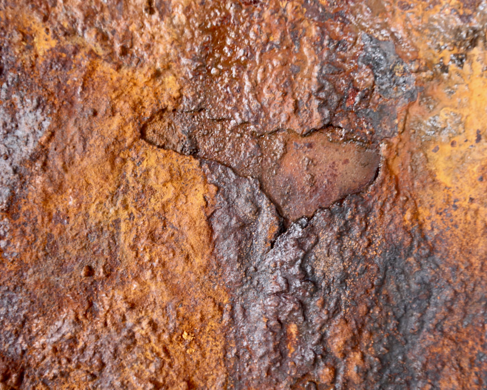 De mørkere kul- og dybtbrune områder, som er særligt fremtrædende øverst og langs kanterne, tilfører maleriet en dramatisk dybde. Overfladen gemmer også subtile antydninger af irgrønt; den svage blågrønne patina, som tilføjer både kompleksitet og kant.
