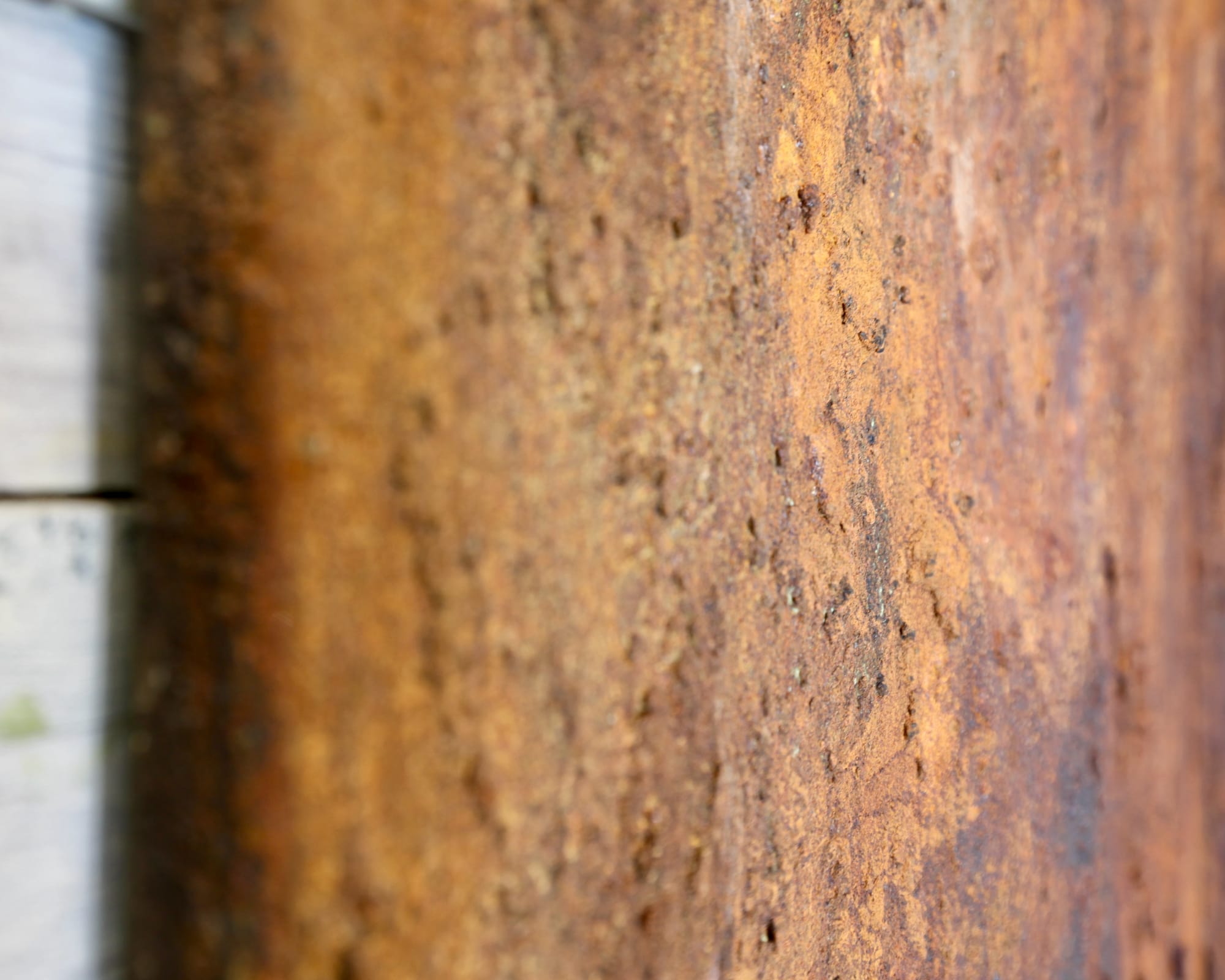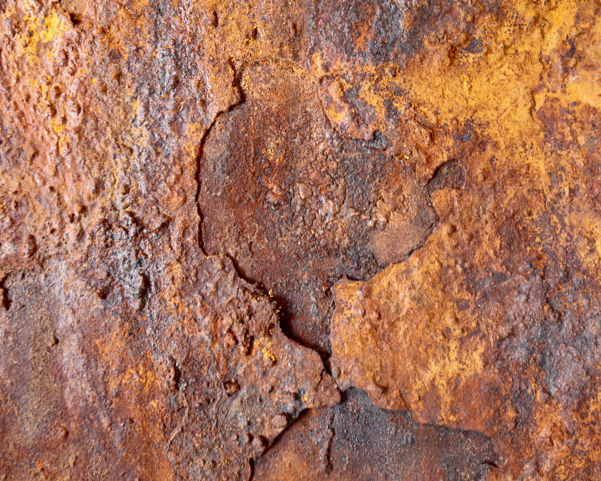 Maleriet har et stærkt vertikalt flow, hvor oxiderede striber løber fra top til bund og skaber en fornemmelse af blid bevægelse.