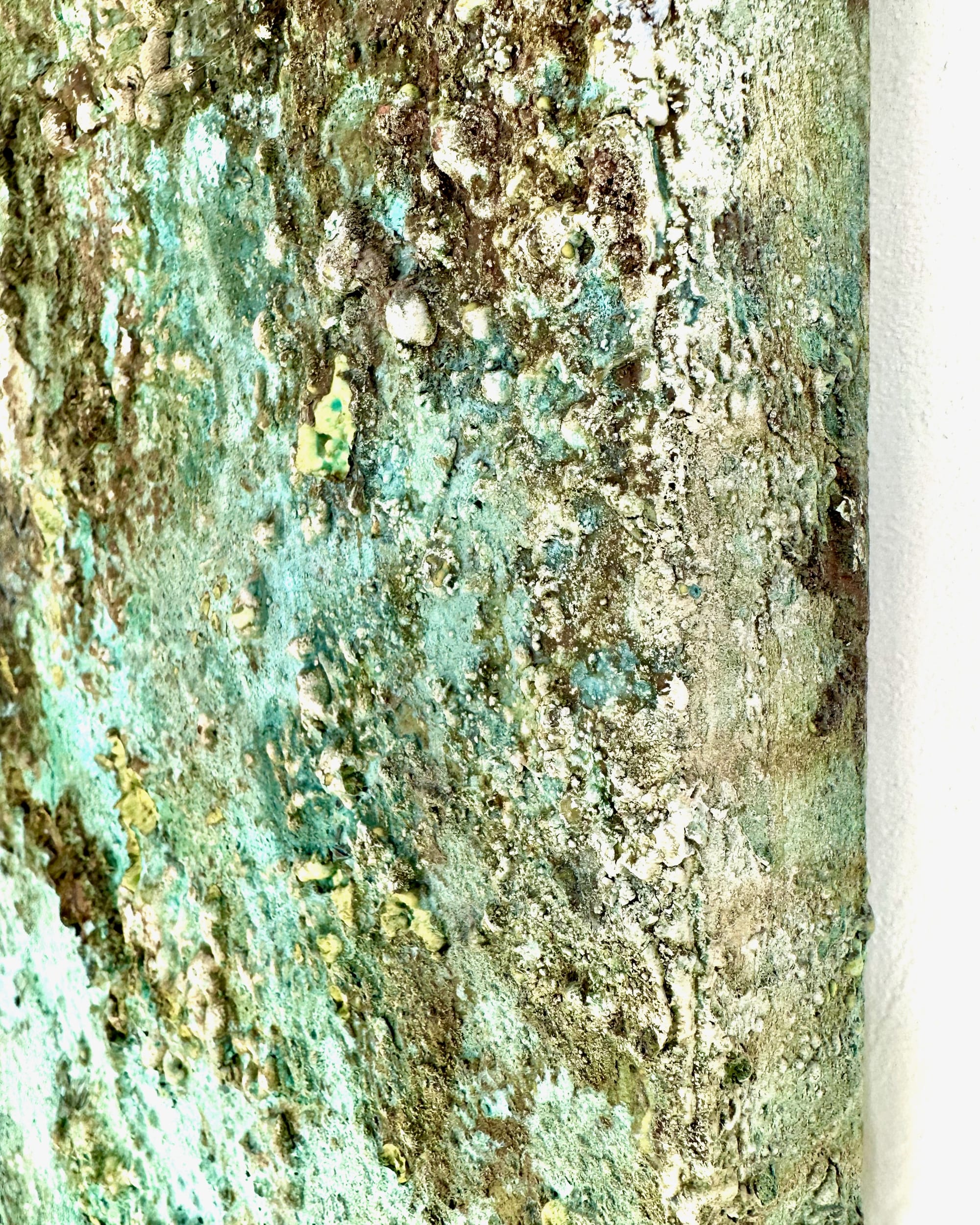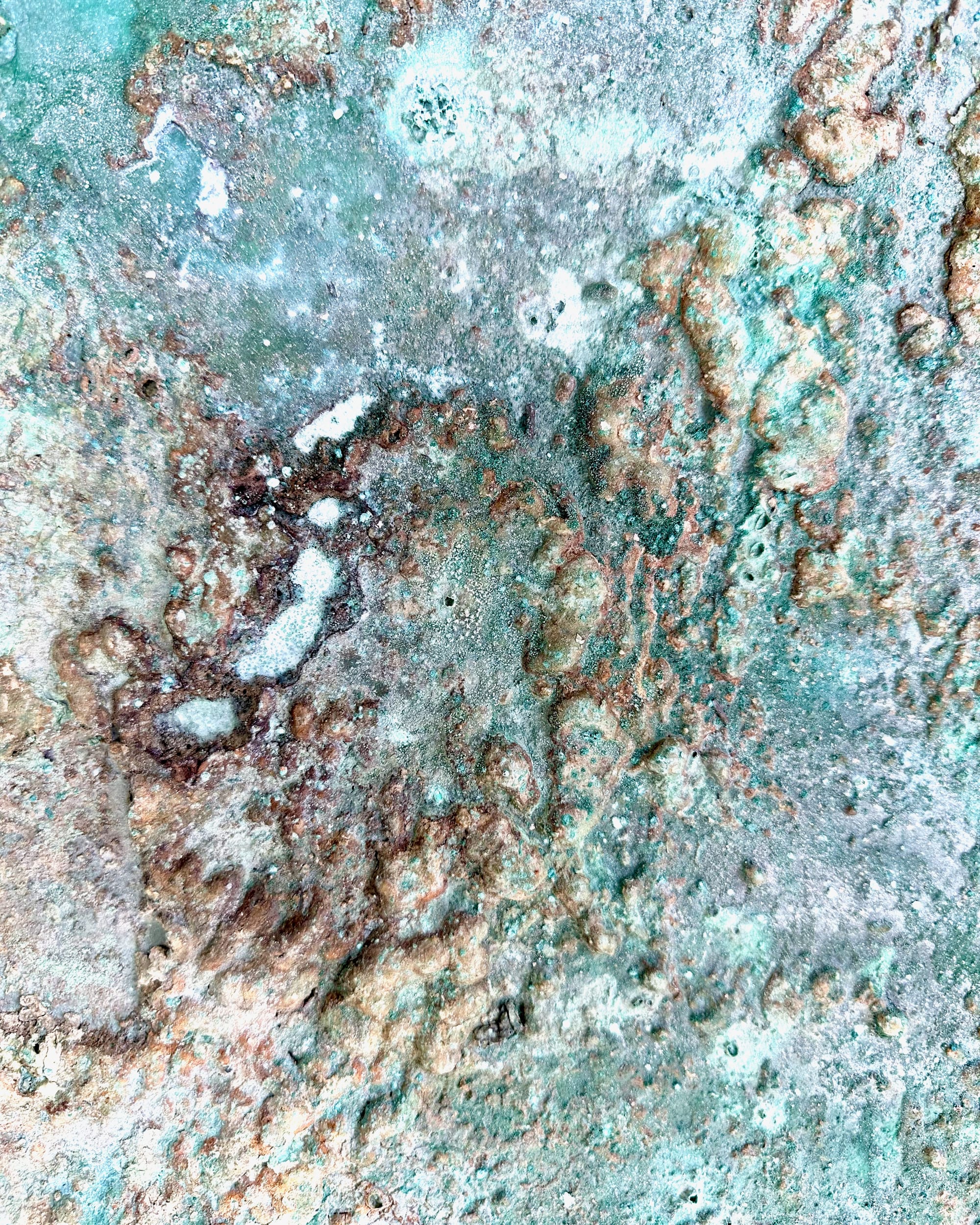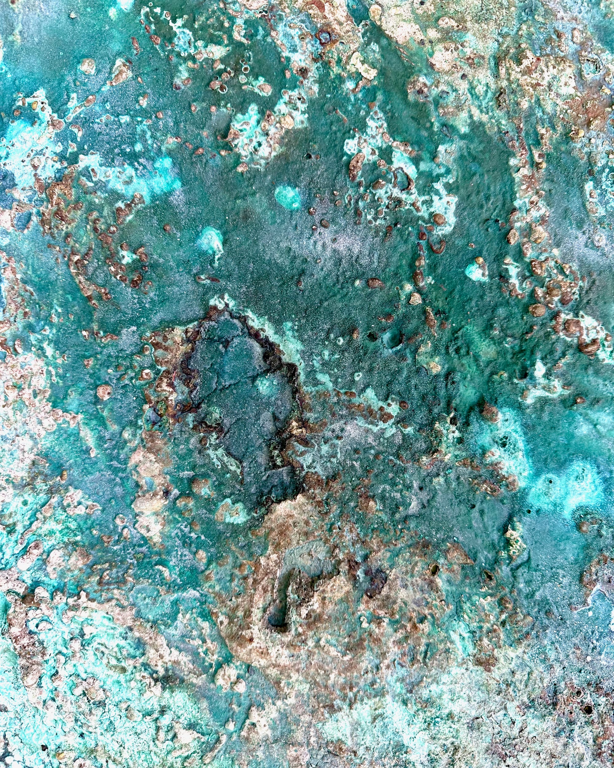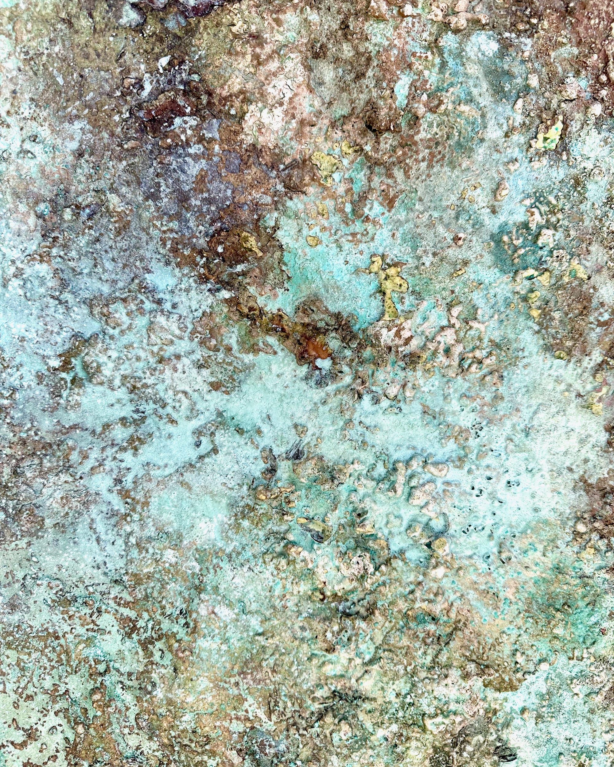 Farvespekteret domineres af dybe turkisgrønne og kobberbrune toner, der flyder sammen i organiske mønstre. Mørkningen og ældningen af nuancerne er skabt med naturlige patineringsagenter som the, rødvin og espressokaffe, så lærredet sine steder fremstår som noget, der har hvilet i jorden gennem årtier. Jeg har tilstræbt at skabe en næsten vulkansk karakter, med områder hvor kobberpulveret har oxideret til intense blågrønne pletter, der bryder op gennem de mørkere partier.
