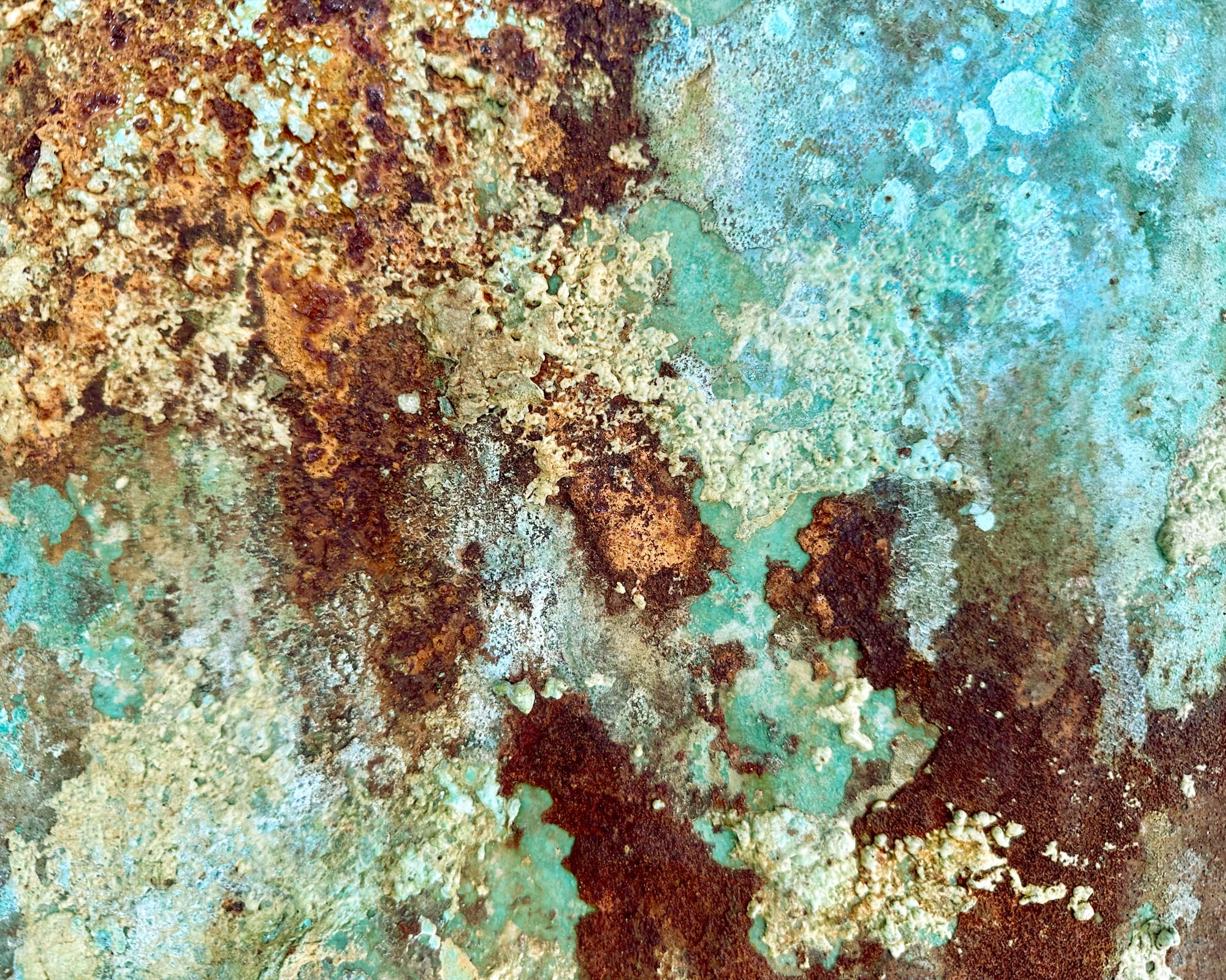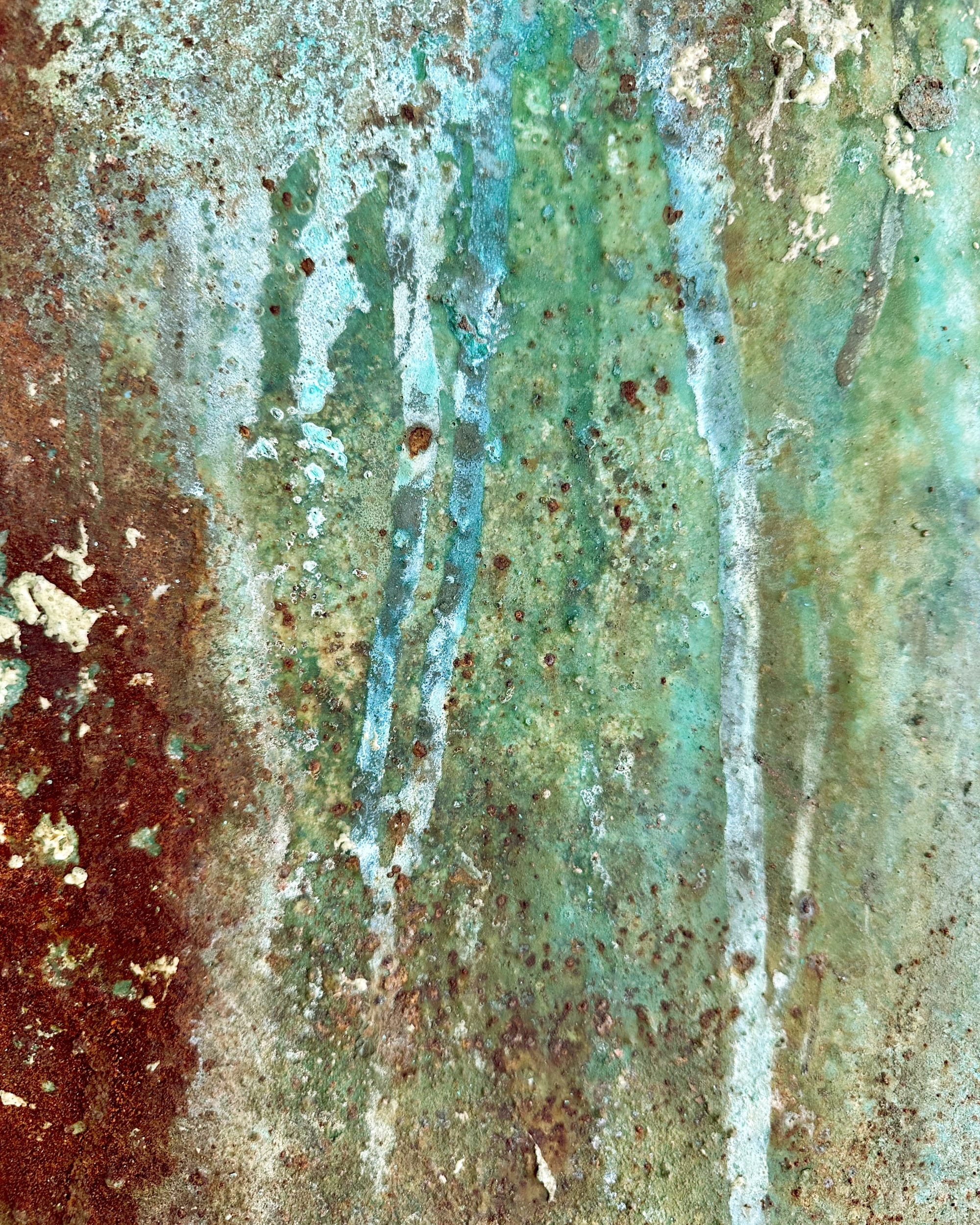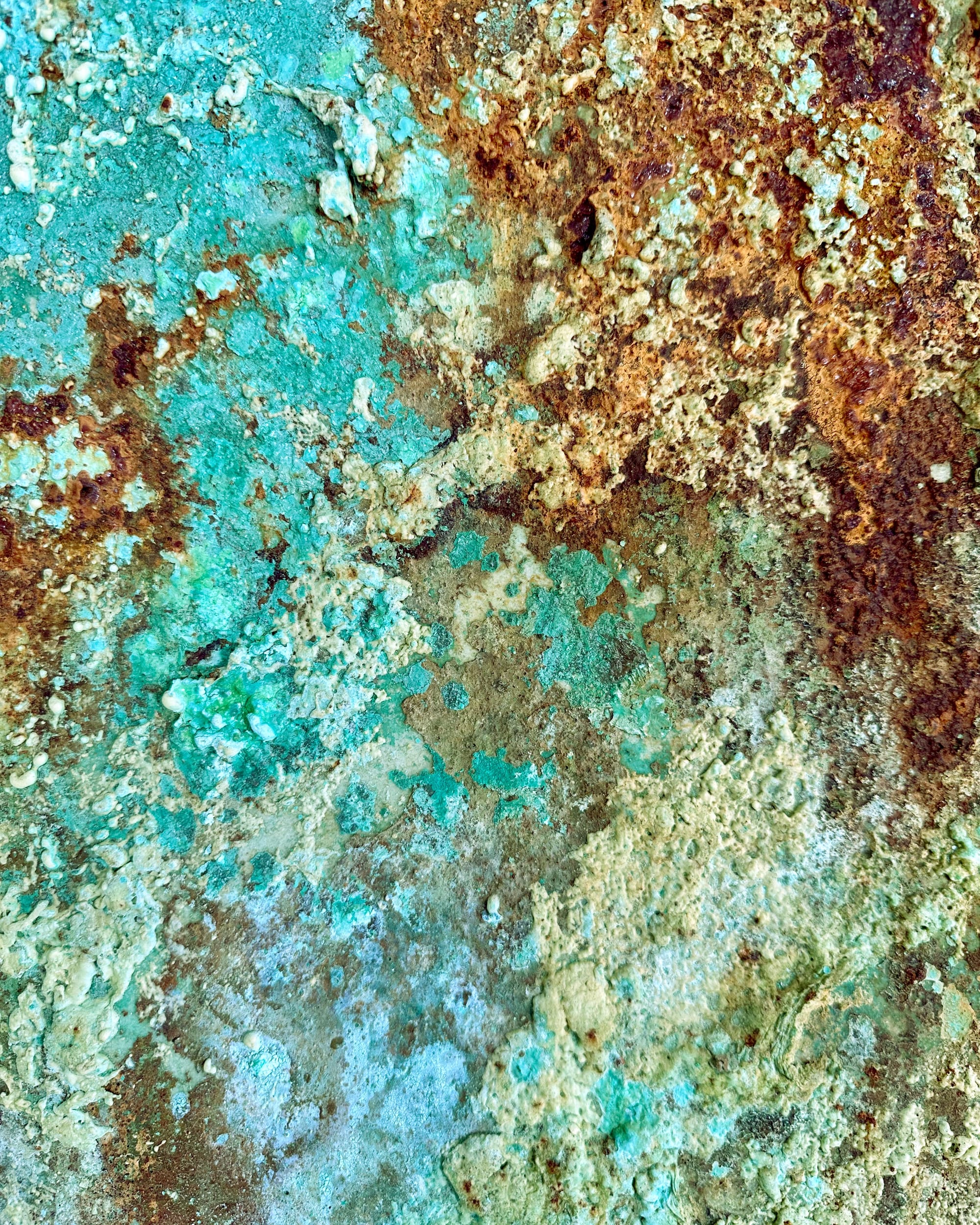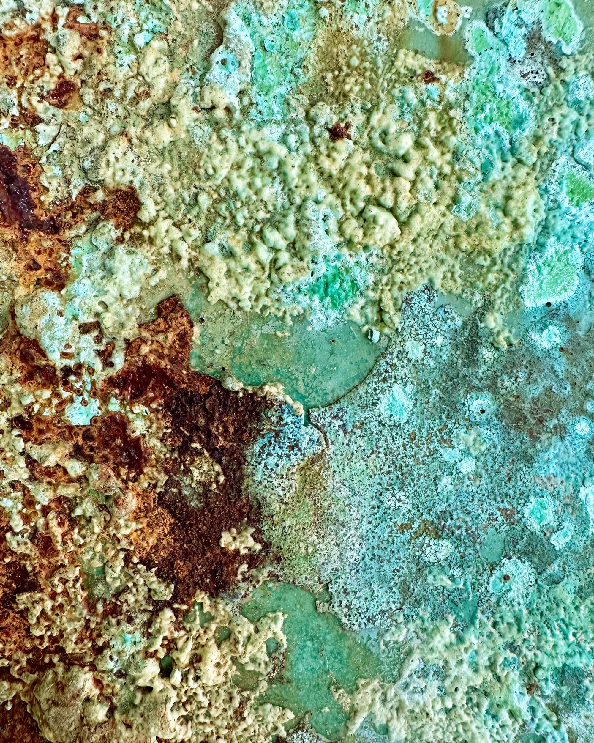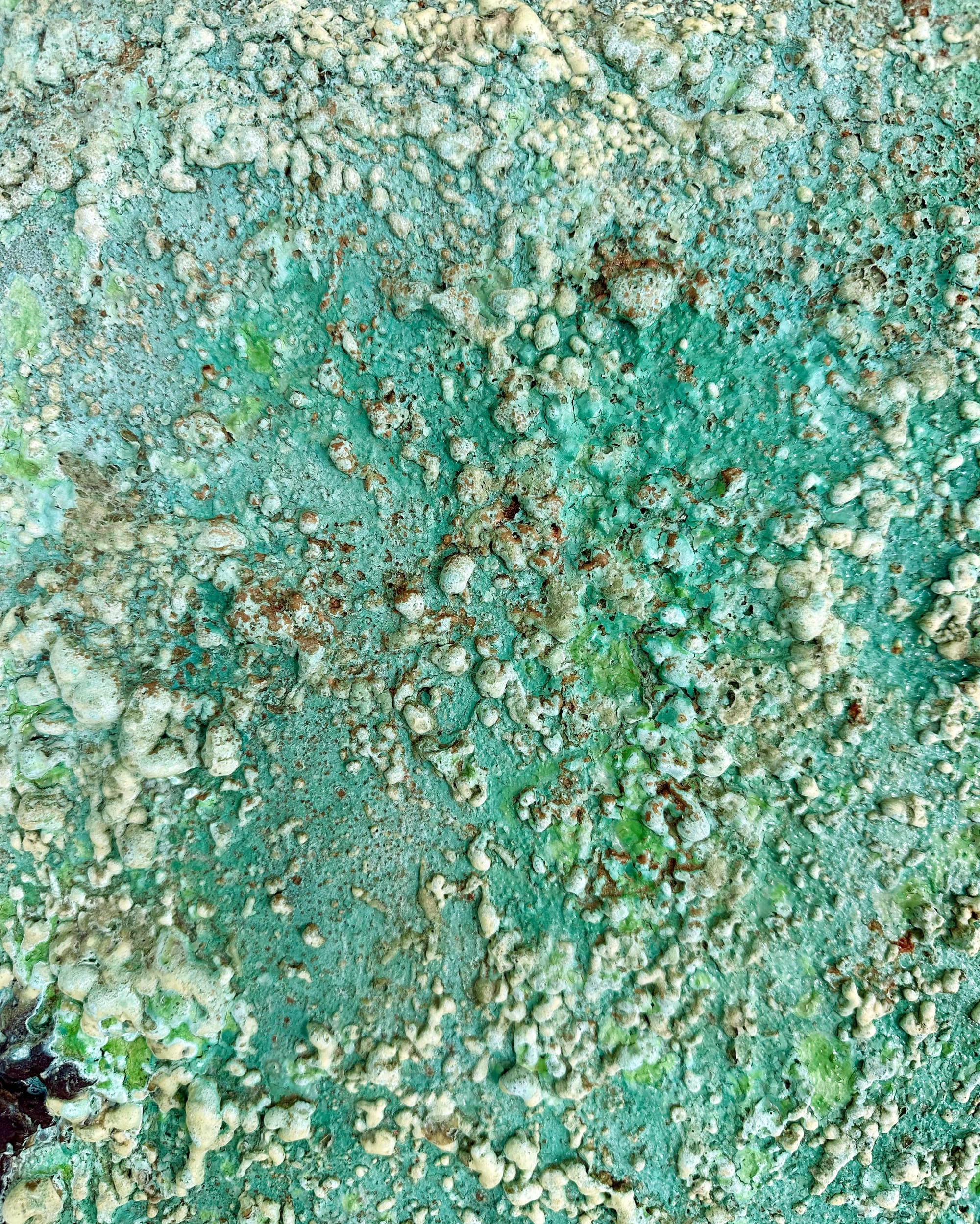 Et lærred, hvor irret kobber er støbt ind i epoxy, og igen er næsten dækket af nye lag og aftegninger af byggeskum: lidt hen i retning af den ursuppe, jeg forestiller mig at livet i sin oprindelse kunne være boblet af . . . .