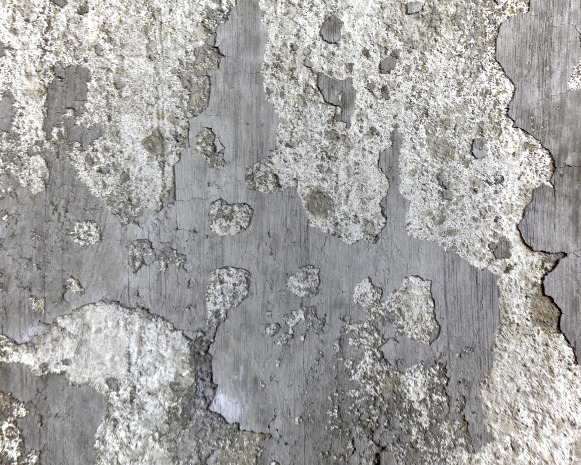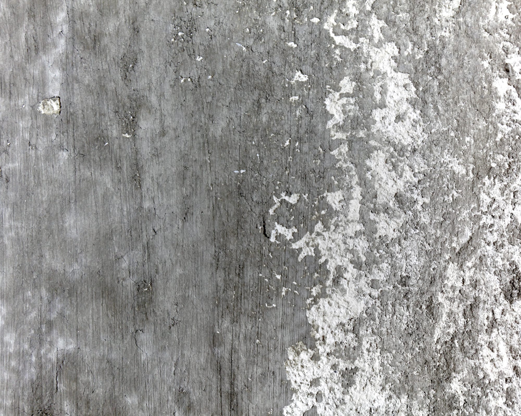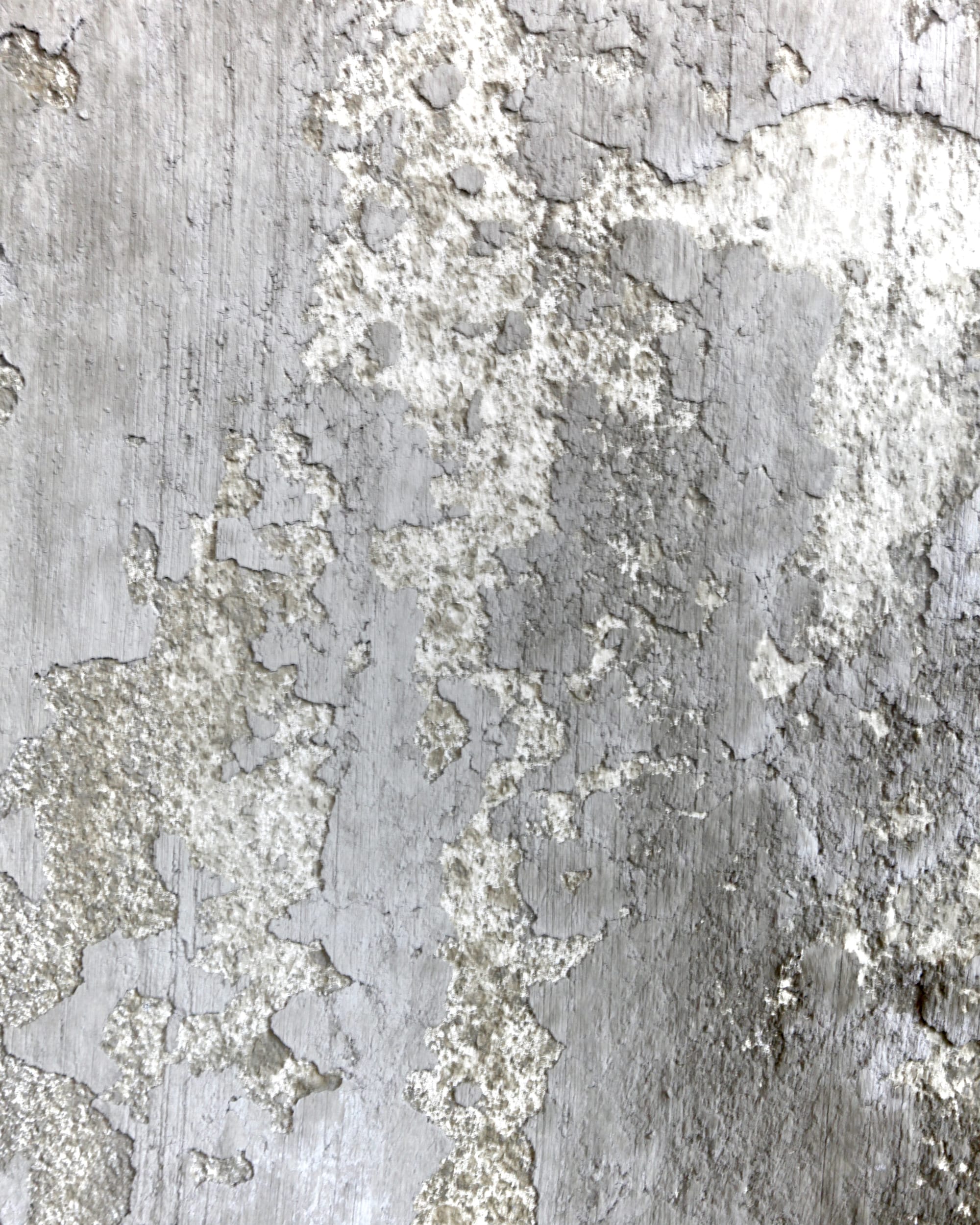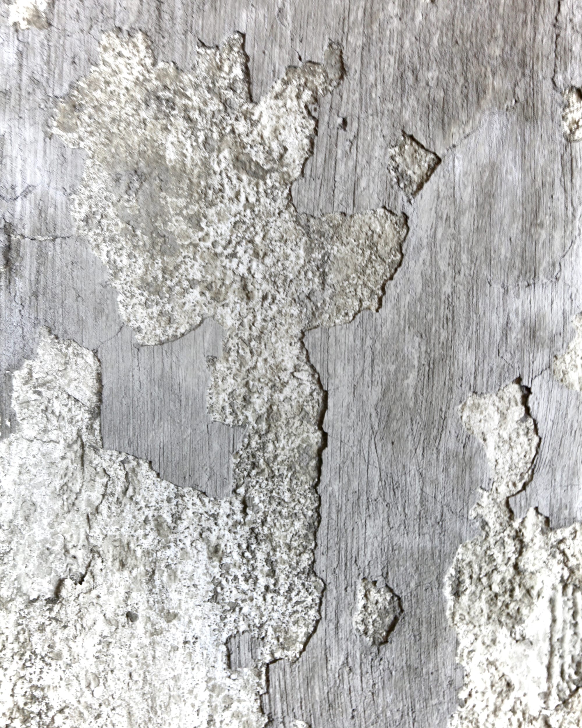 Resultatet er en overflade, hvor vertikale striber af afskallet cement skifter mellem kølige, næsten hvide toner og dybere grå-brune nuancer. Nogle områder fremstår næsten pudderagtige og matte, mens andre har en mere kompakt, stenlignende karakter. Her og der titter gullige og brunlige undertoner frem, som spor af de processer der er foregået under overfladen.