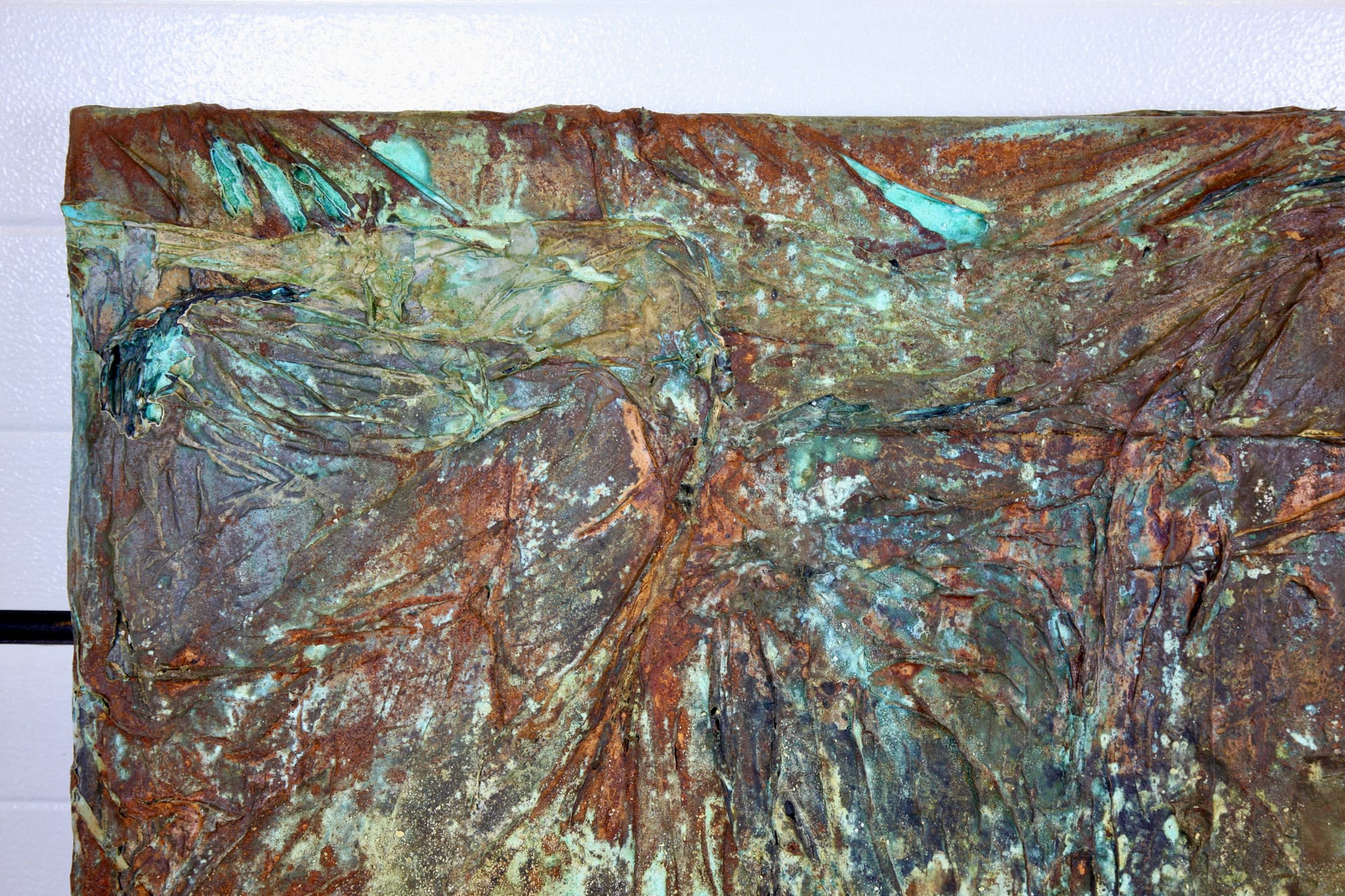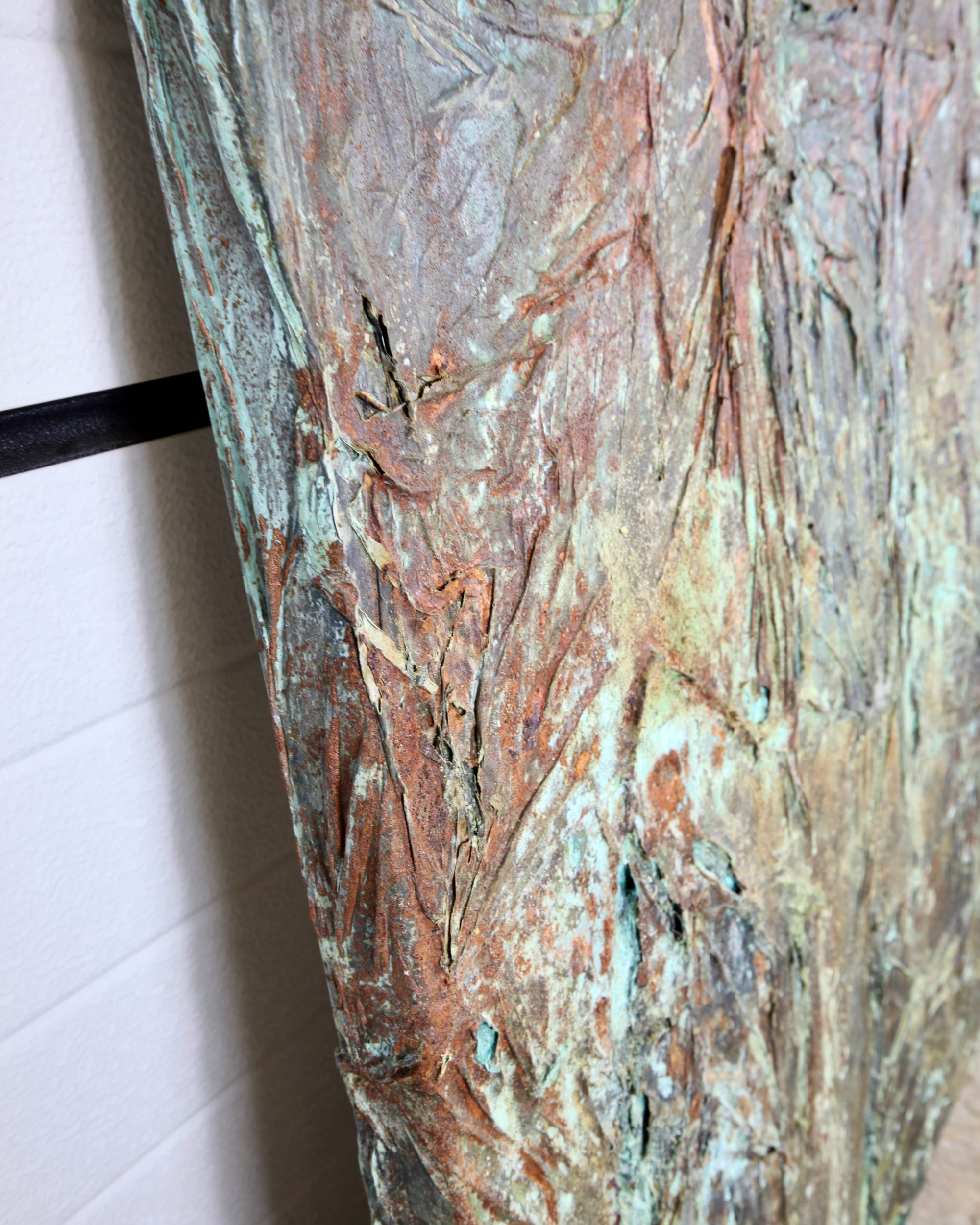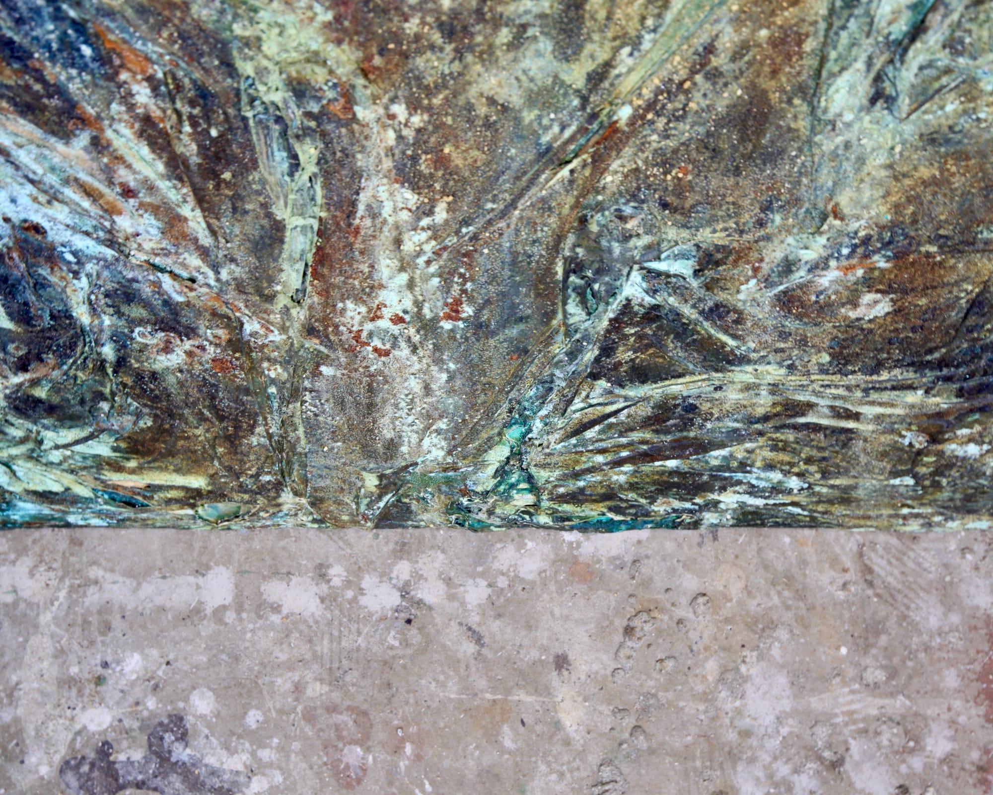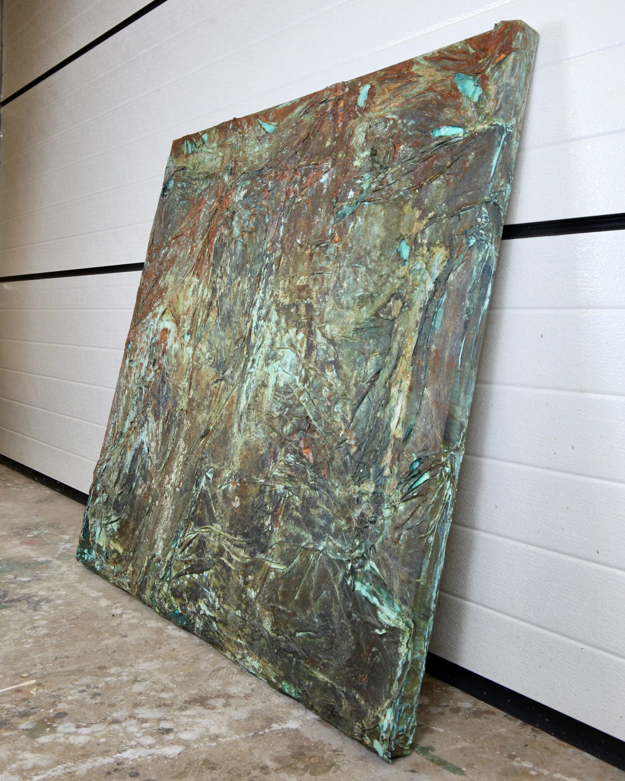 Jeg har stræbt efter et organisk, stemningsfuldt udtryk, der indbyder til fordybelse i det komplekse samspil mellem materialerne og min egen skabelsesproces. Maleriets lag fremstår forvitrede og ældede, mens glimt af lysere irgrønt titter frem og antyder skjulte dybder under overfladen.