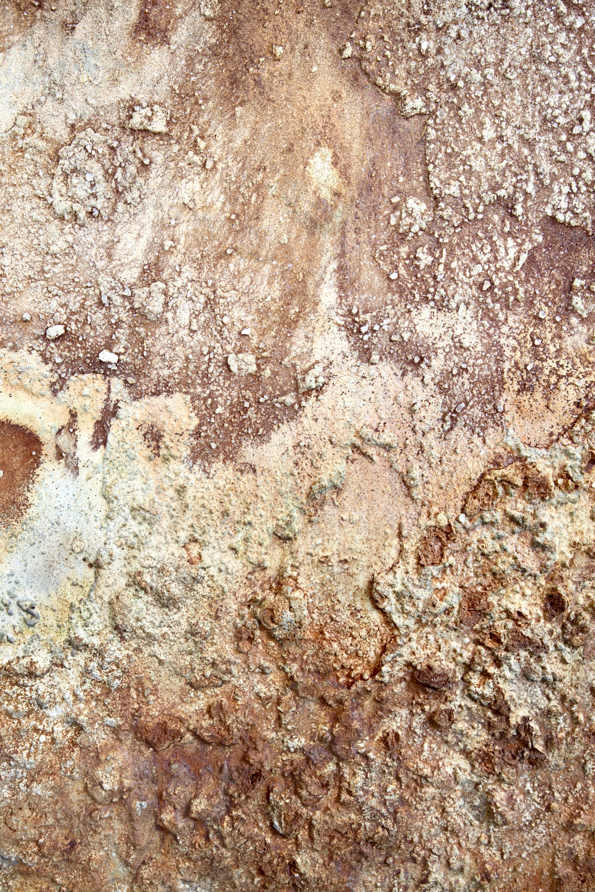 Store flager af den café au lait-brune oxidation dækker det meste af lærredet, med variationer fra lyseste latte til dyb mørk chokolade. Ind imellem bryder kølige irgrønne pletter igennem, som minder om det underliggende kobber, der stadig kæmper sig frem.