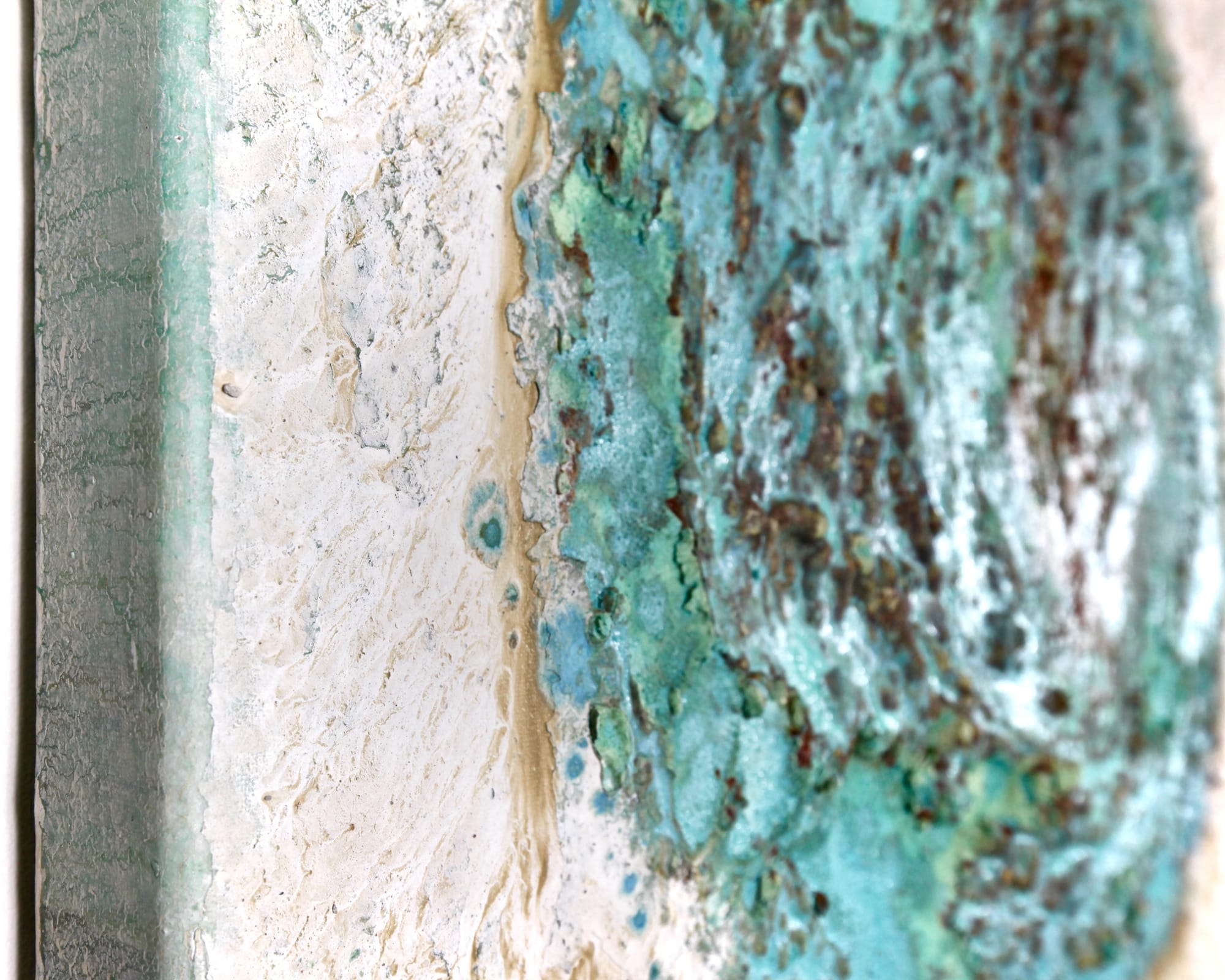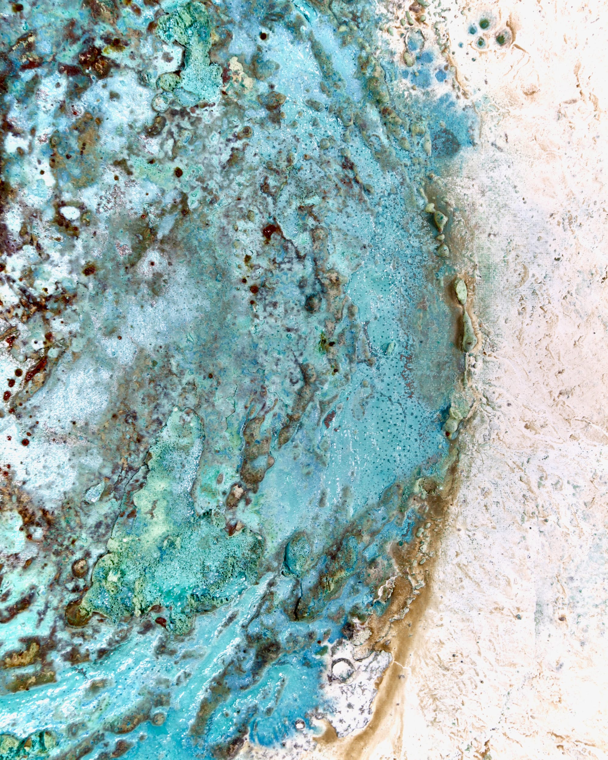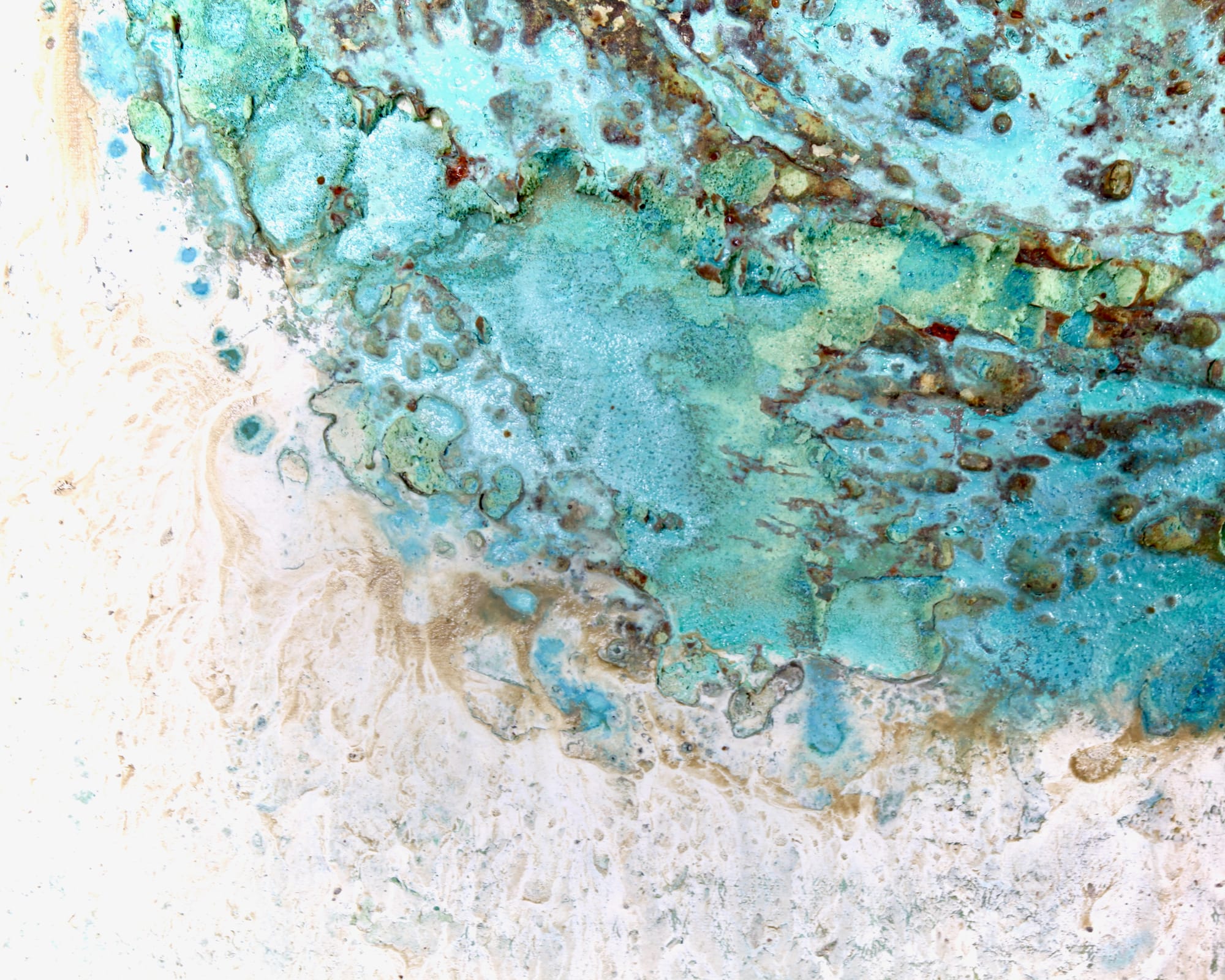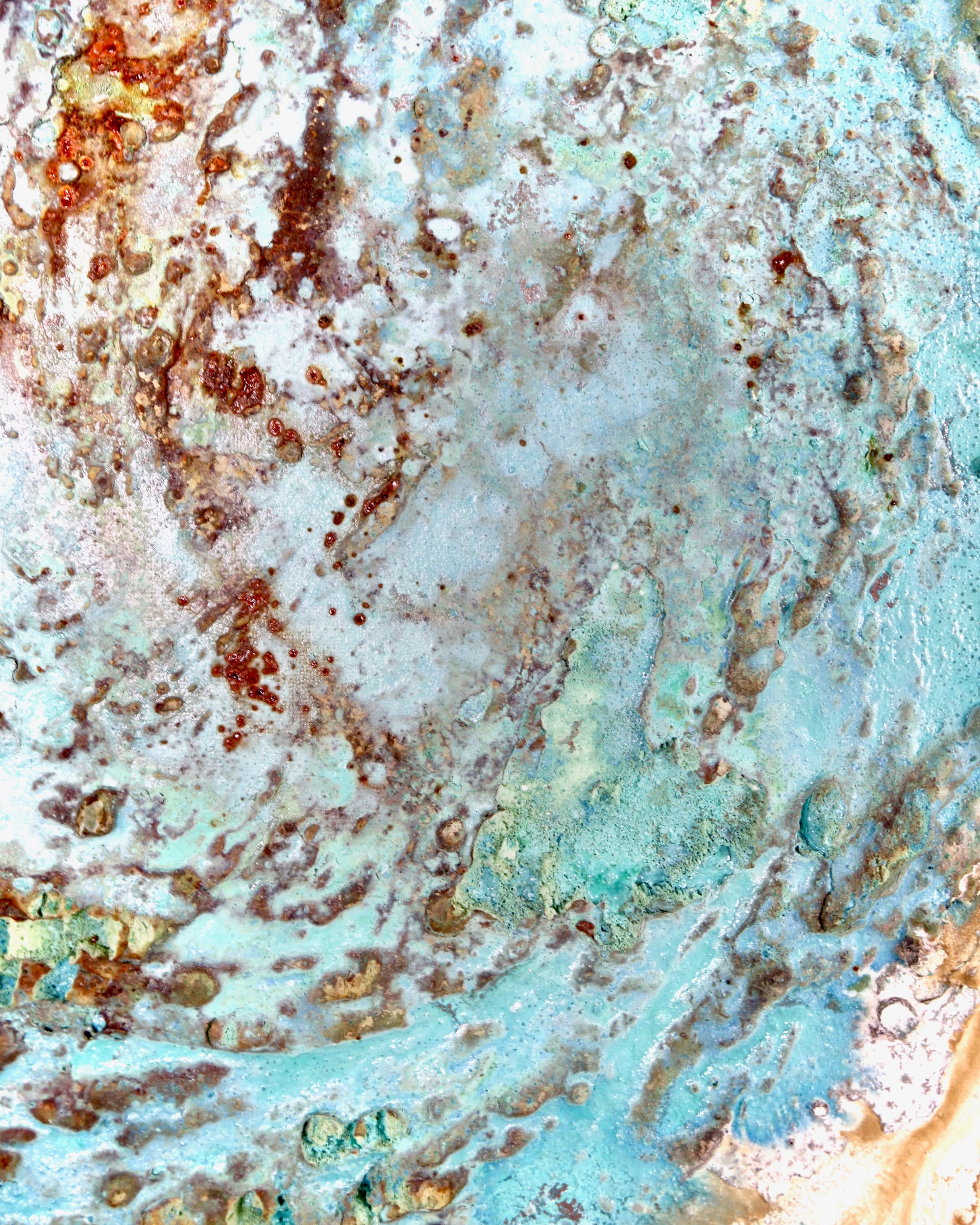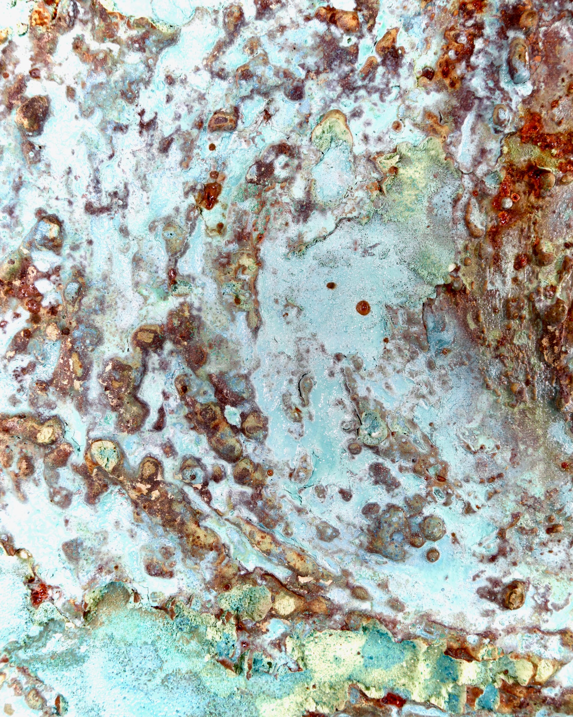 De mørke rustpletter breder sig uforudsigeligt gennem den turkise patina, mens den beige baggrund omkranser det hele som et neutralt felt.