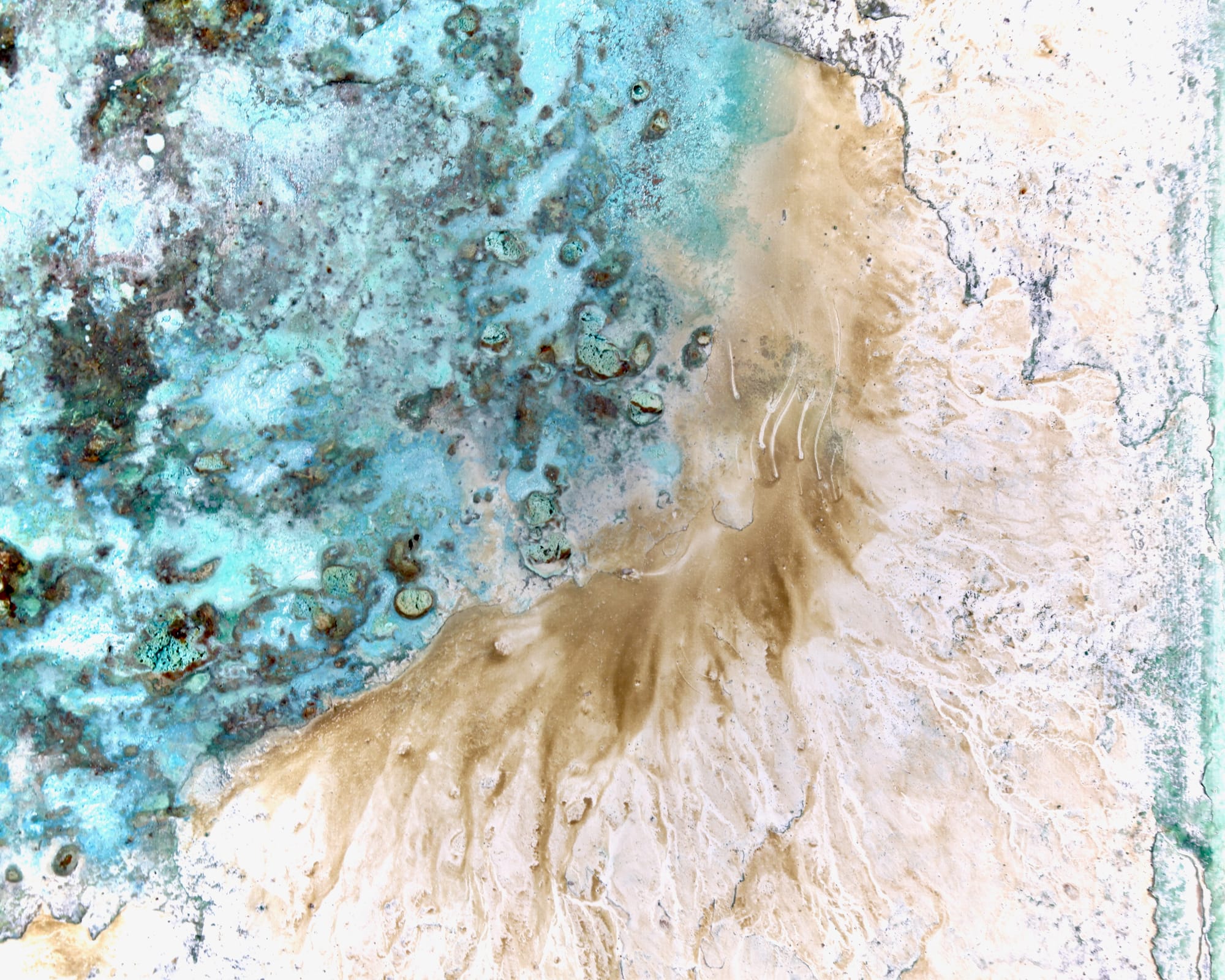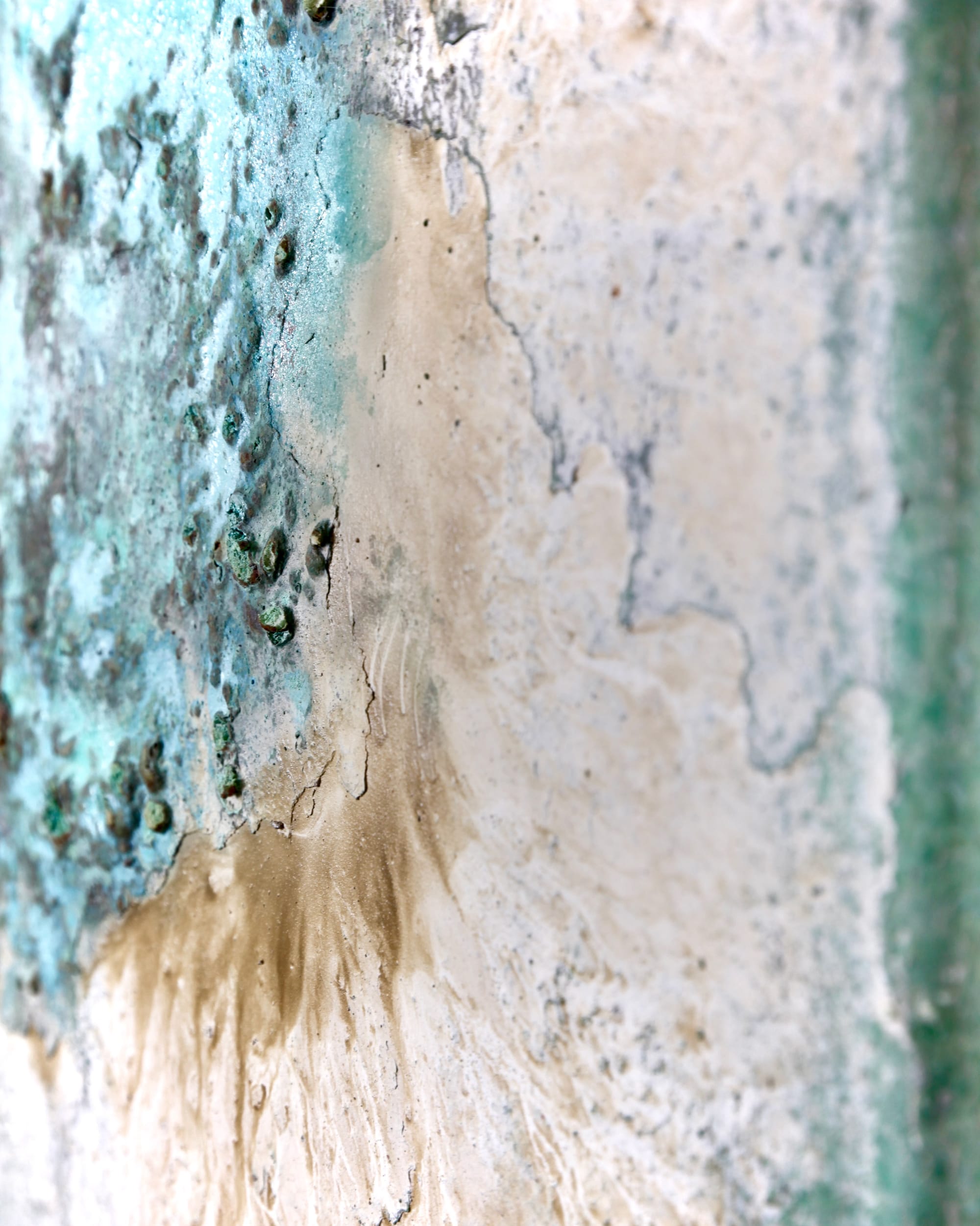 Det turkise, oxiderede kobber holder stand i midten, men omgivelserne trænger på med rust, ir og hvide overmalinger.