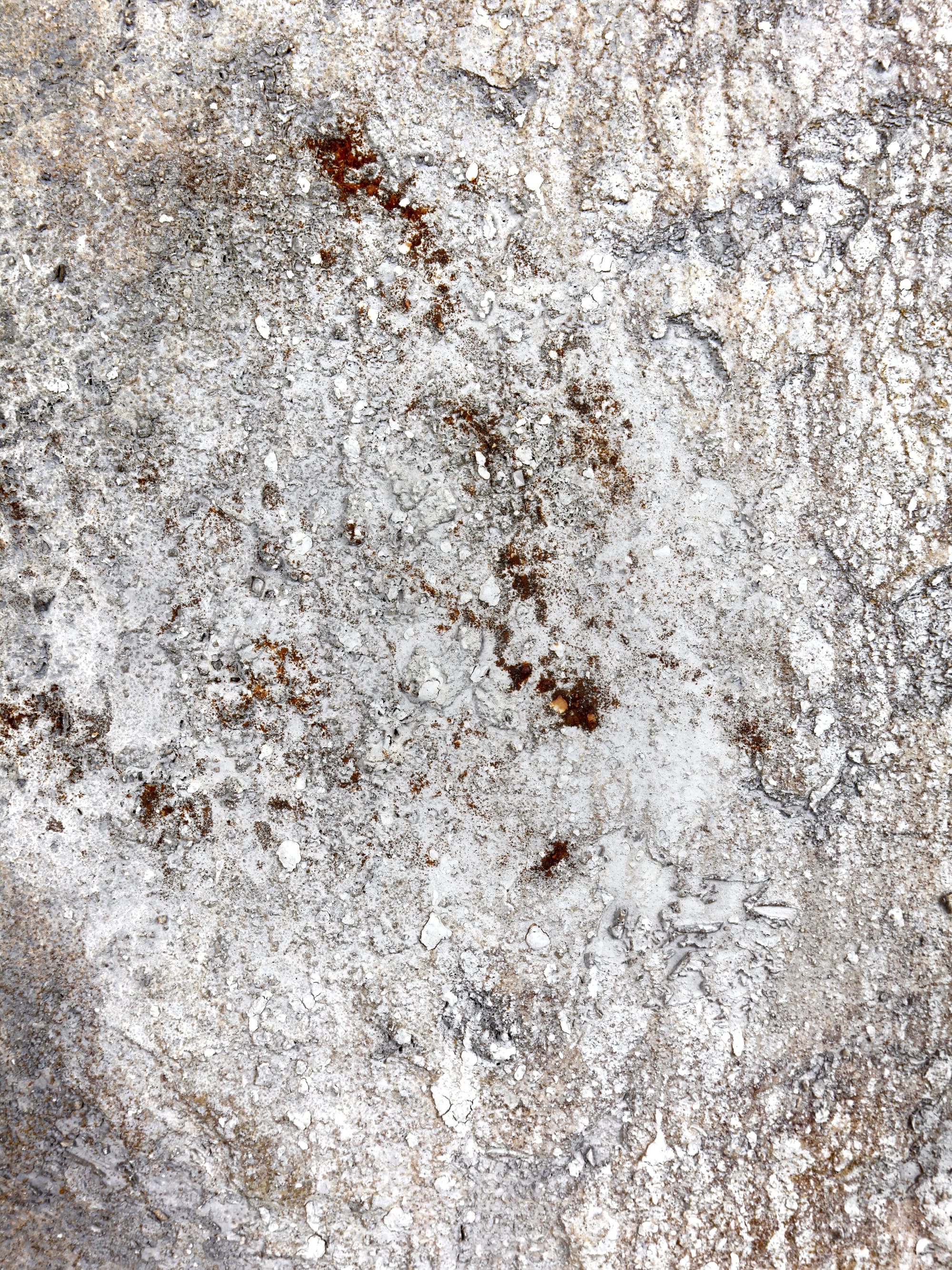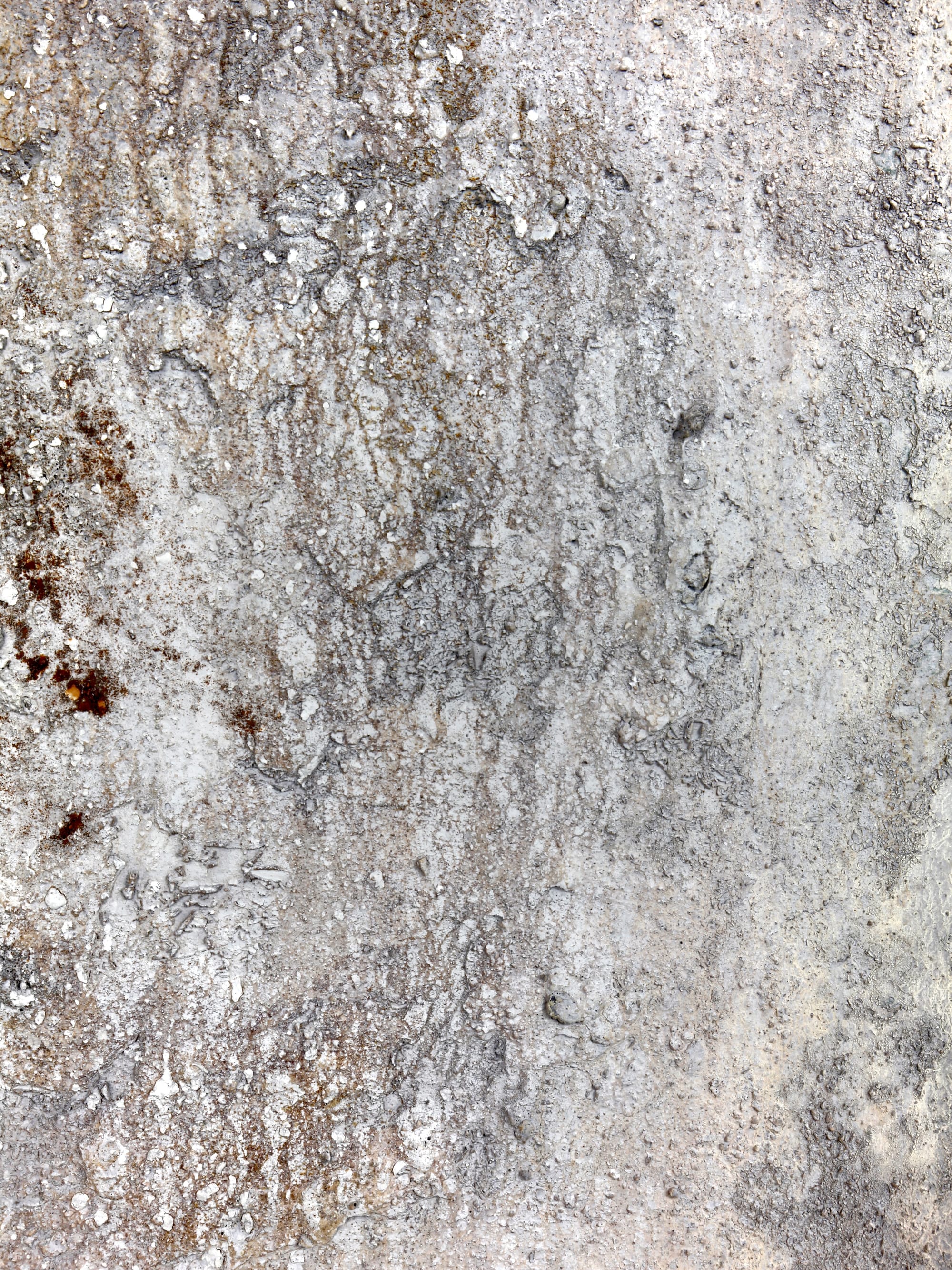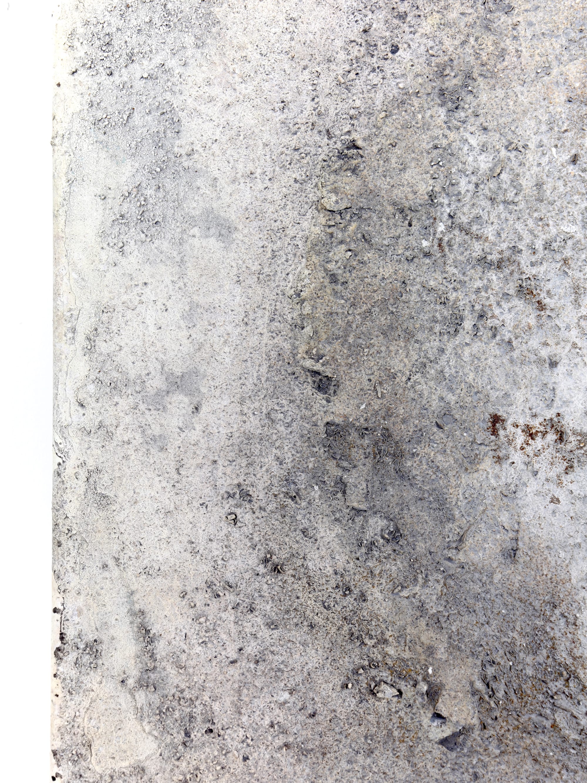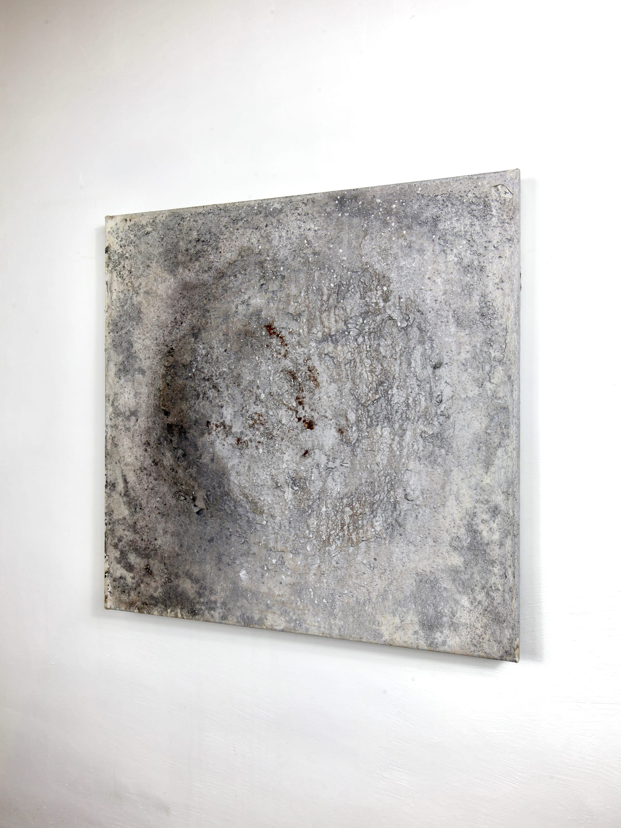 Nu står værket med en forvitret overflade i grå, hvide og beige nuancer, næsten som gammel beton eller kalksediment der langsomt er eroderet. Rust bryder frem i de nedre hjørner - særligt i venstre side - som organiske pletter der ikke lader sig kontrollere. Den minerallignende tekstur giver associationer til noget der har ligget begravet og siden er blevet udgravet igen.