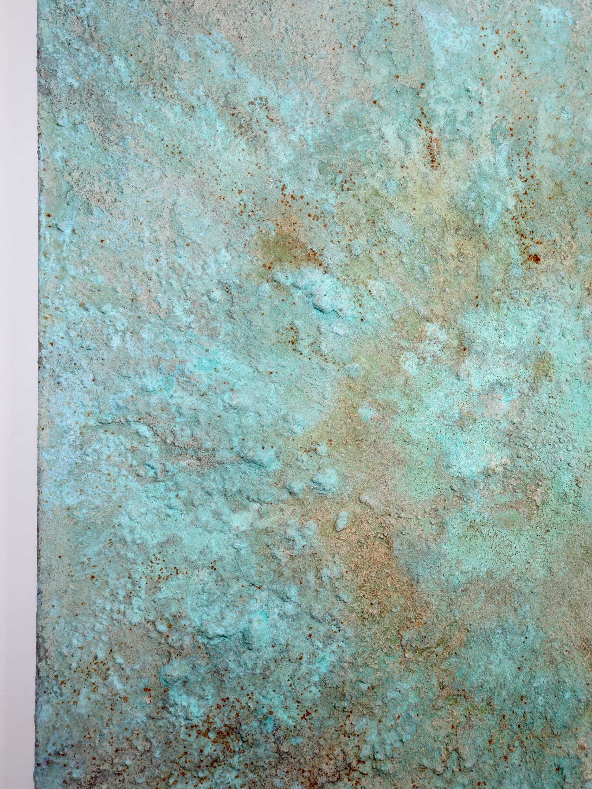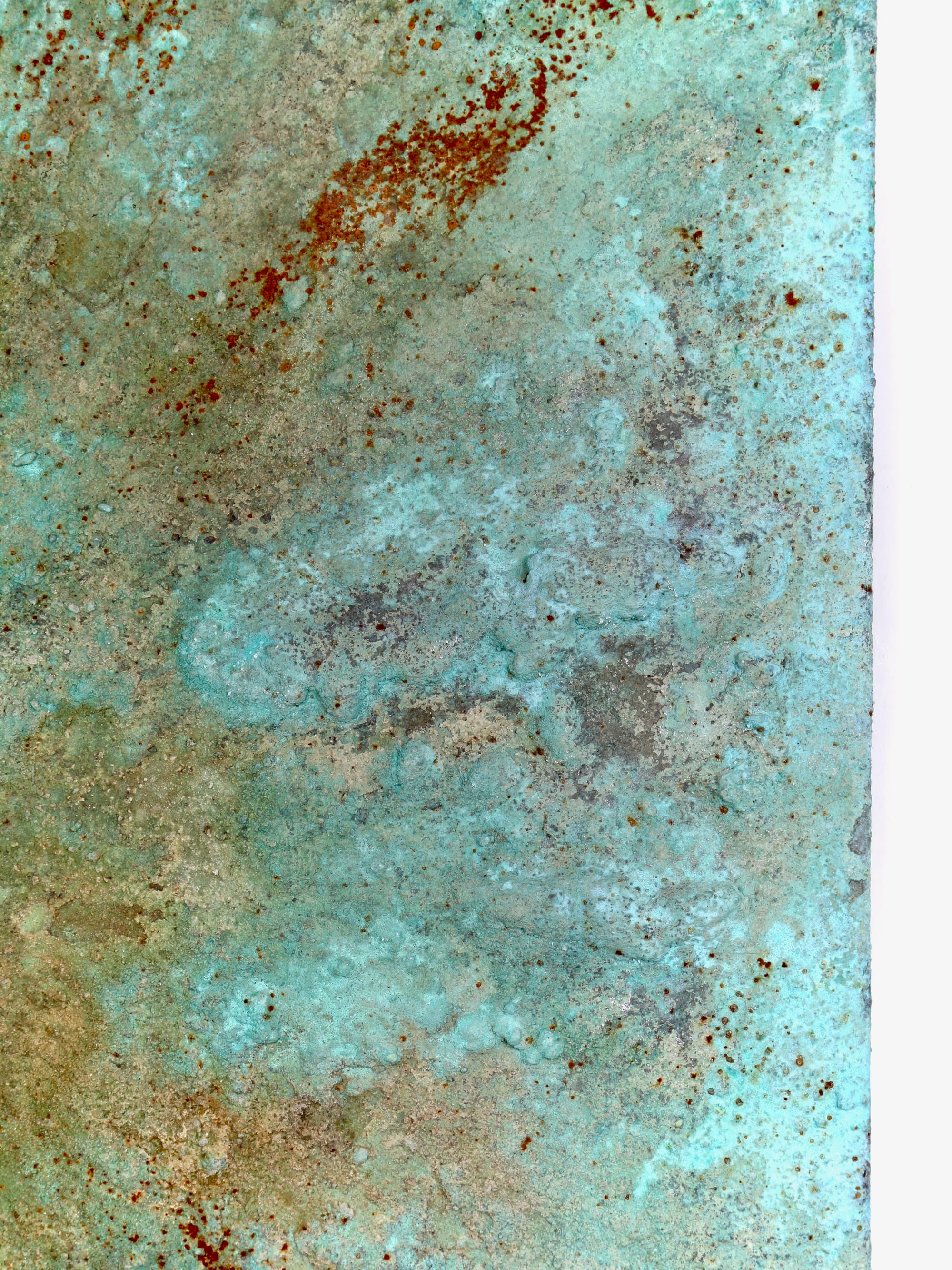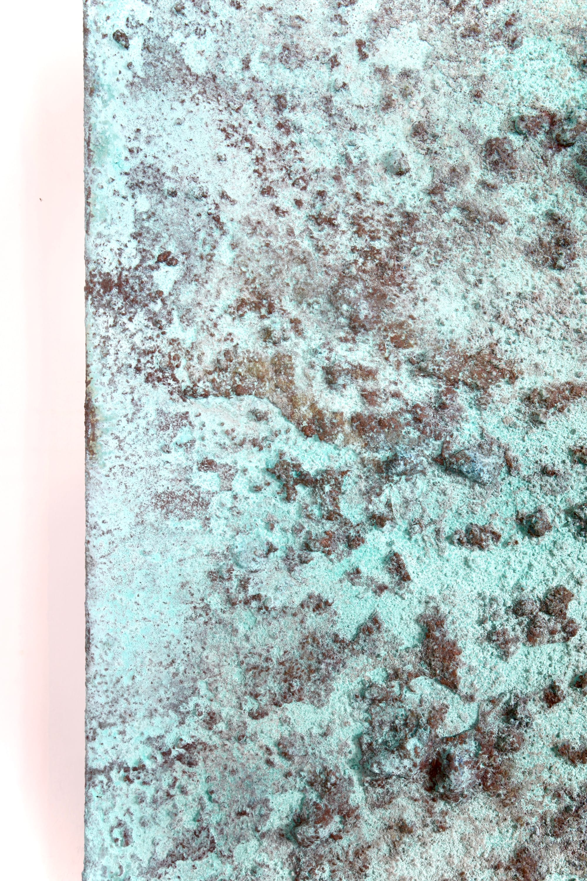 Patinaen spænder fra næsten hvide, lyse turkis nuancer til dybere, mere intense grønne toner, hvor oxidationen har fået lov at arbejde i sit eget tempo.