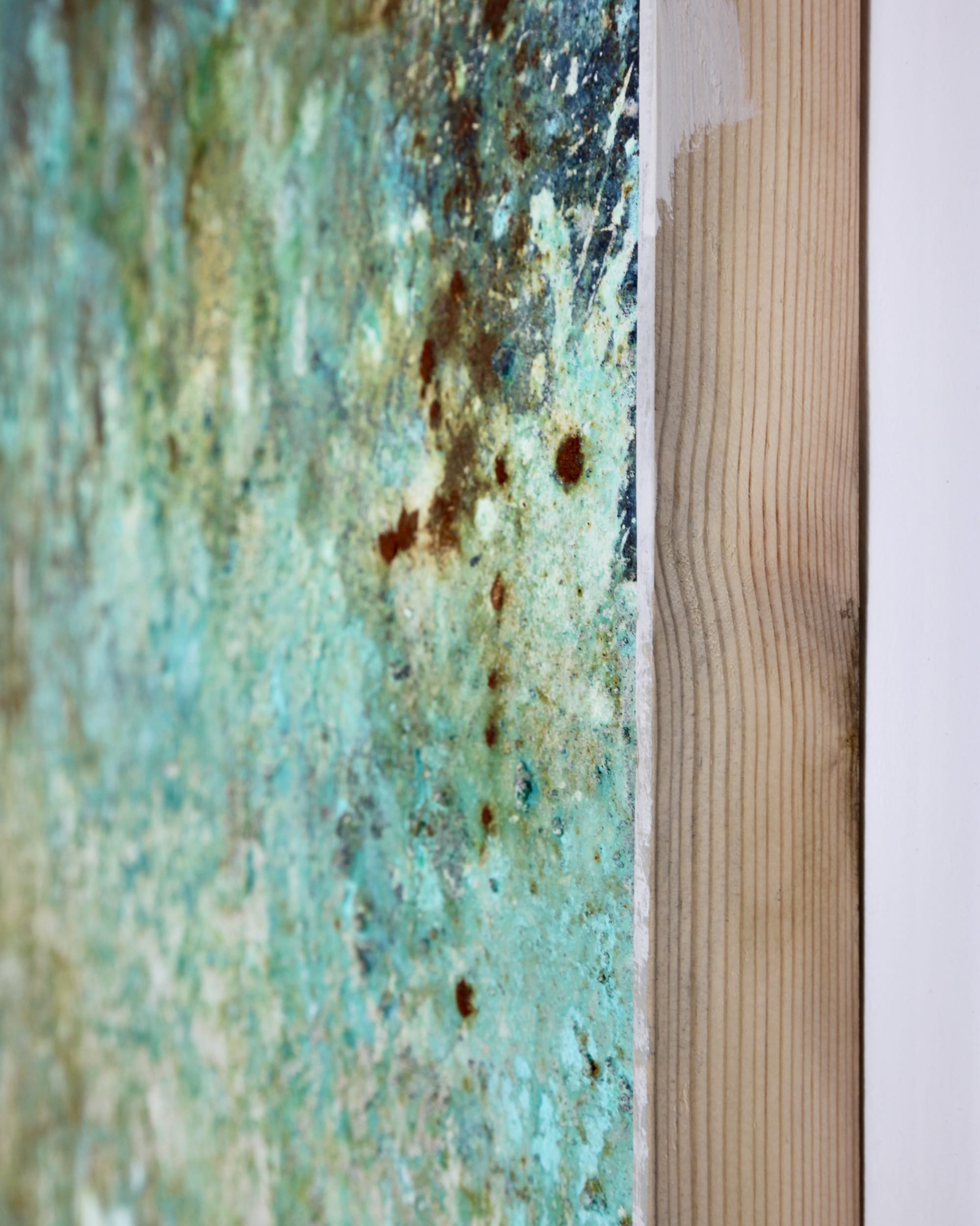 100 x 100 cm: mixed media på opspændt lærred. Ramme af genbrugstræ.