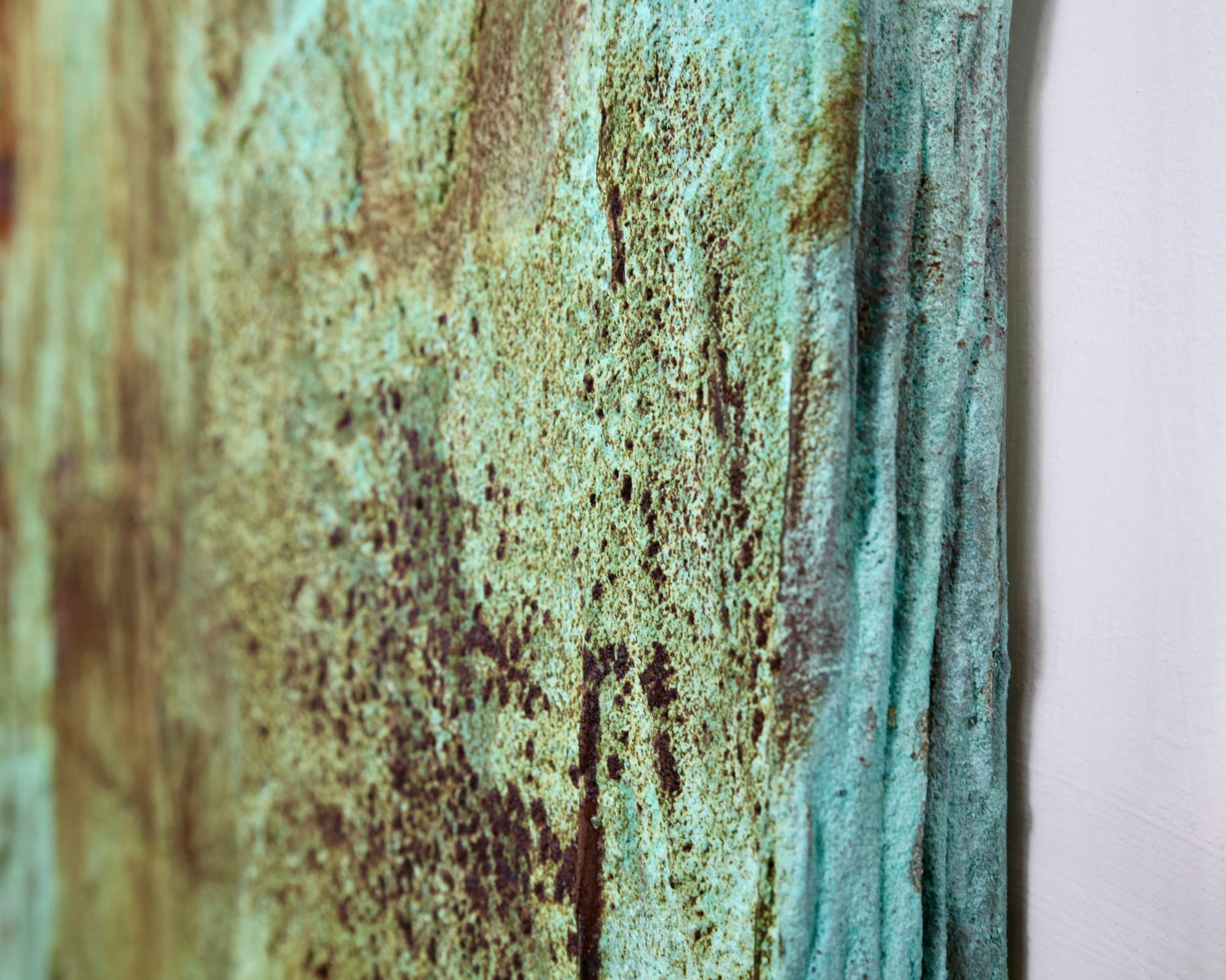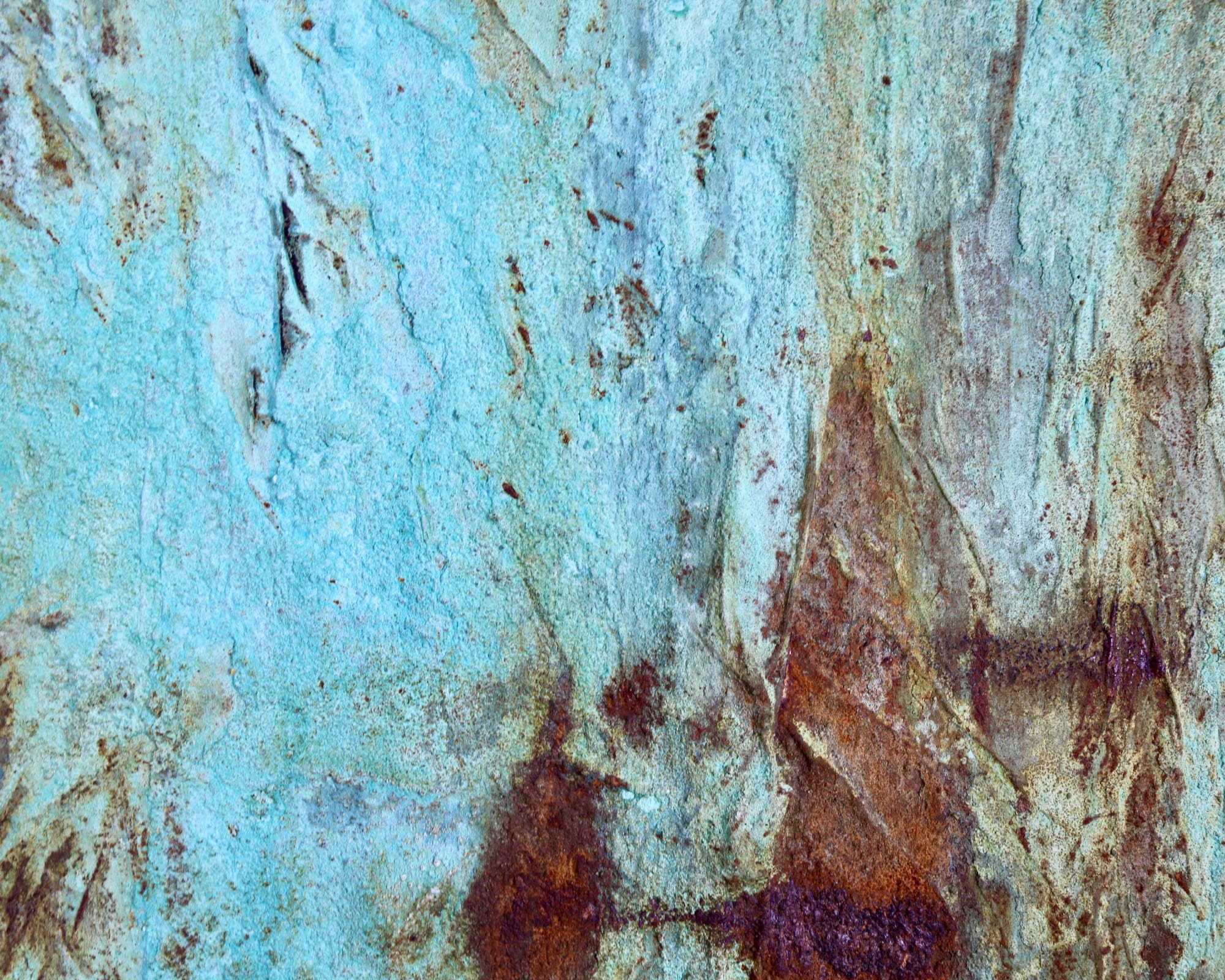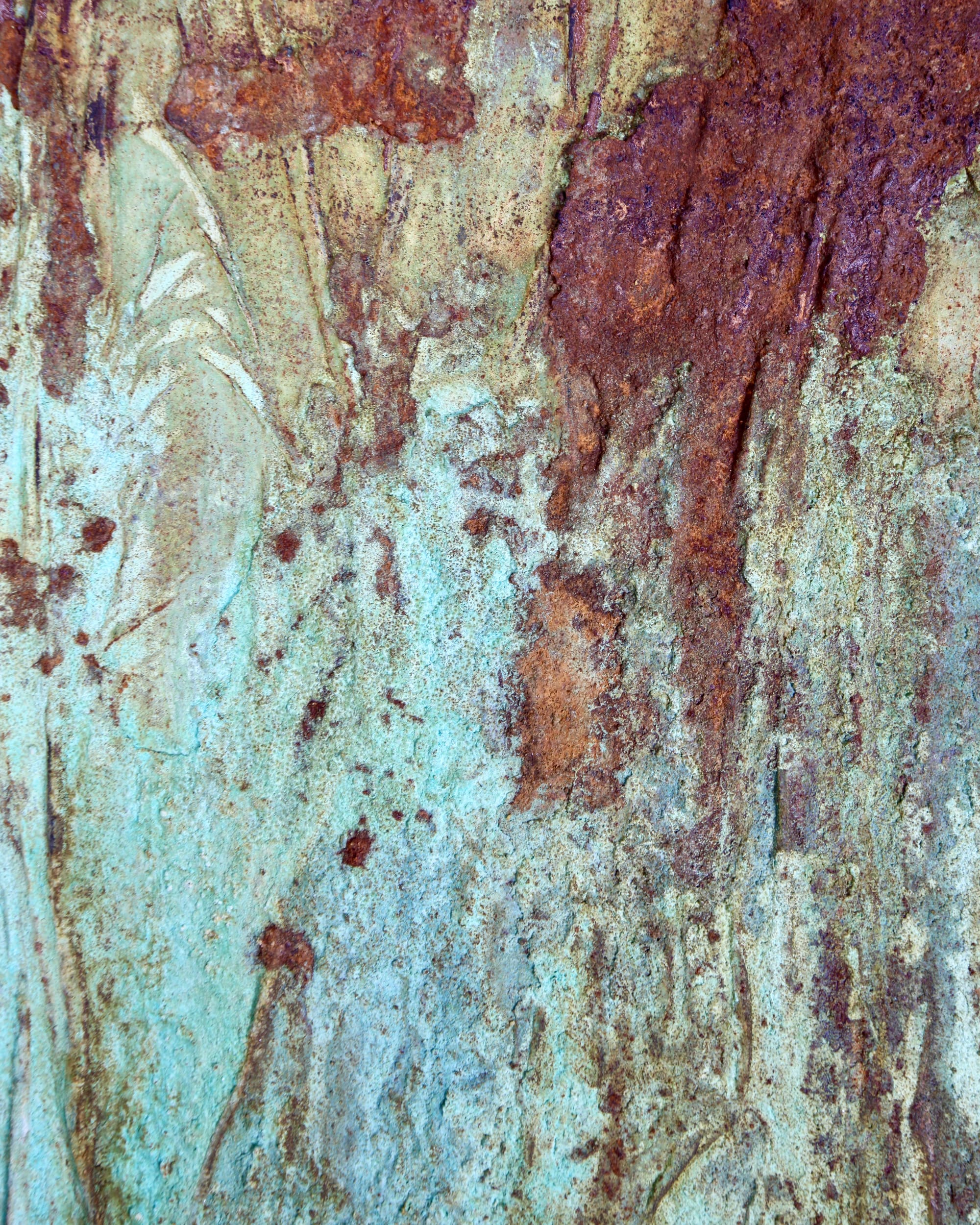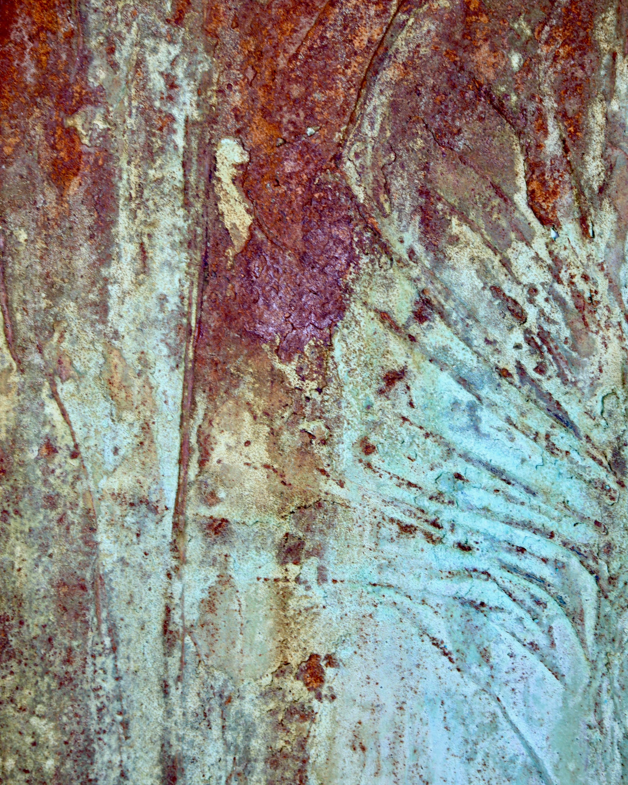 Selv rust, vi er vant til at betragte som en slutfase, hvor noget langsomt går i opløsning, er også bare en del af en cyklus: I værket hér konkret illustreret ved at jeg sine steder simpelthen har valgt at banke rusten af.