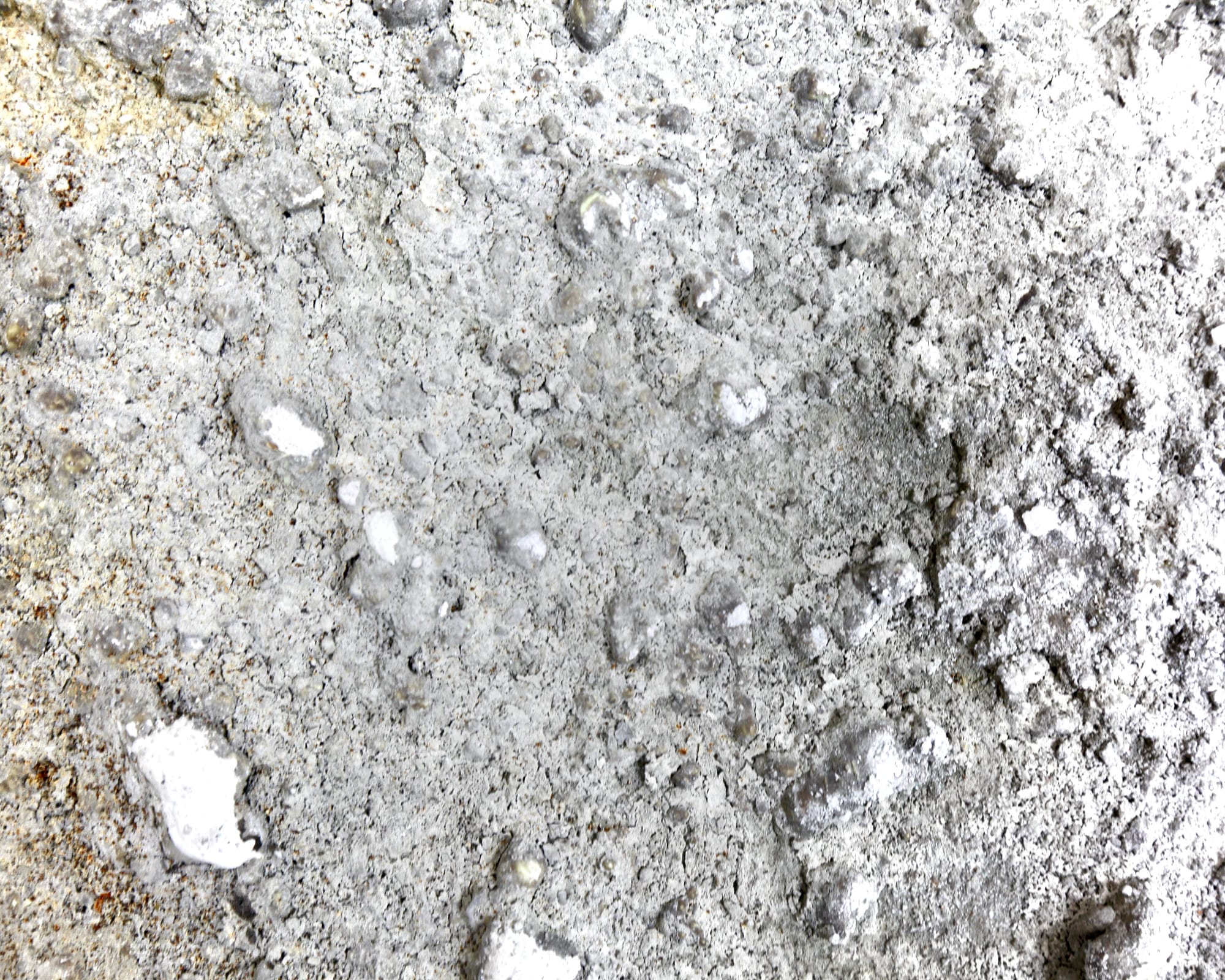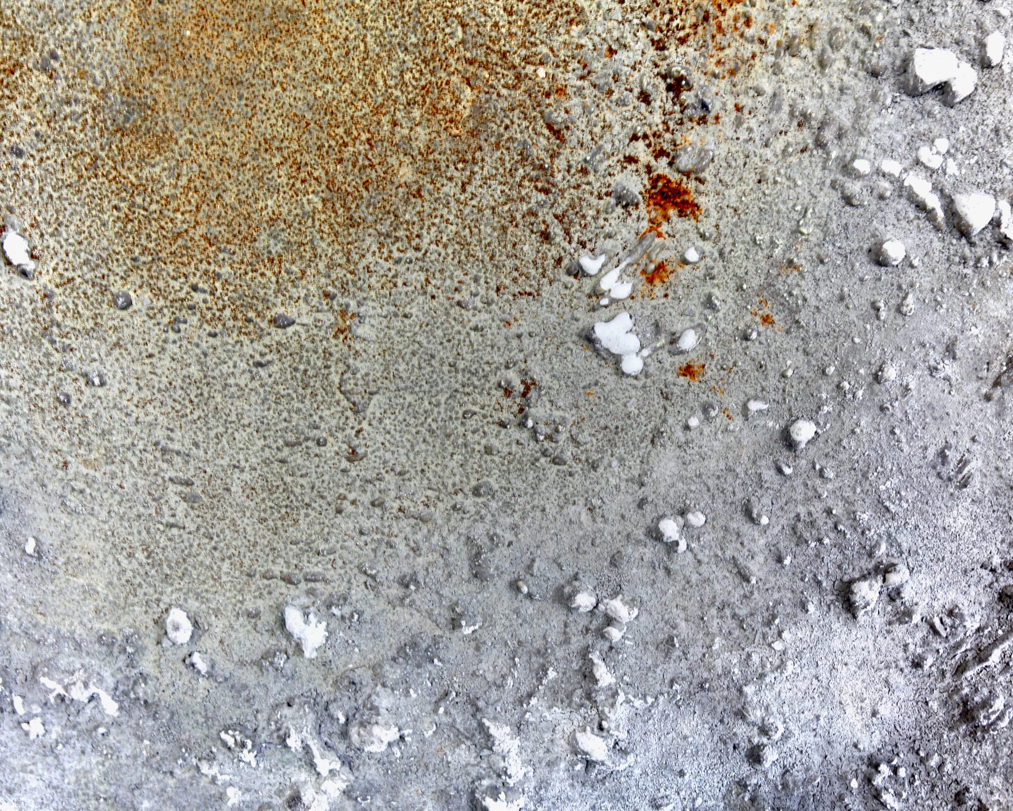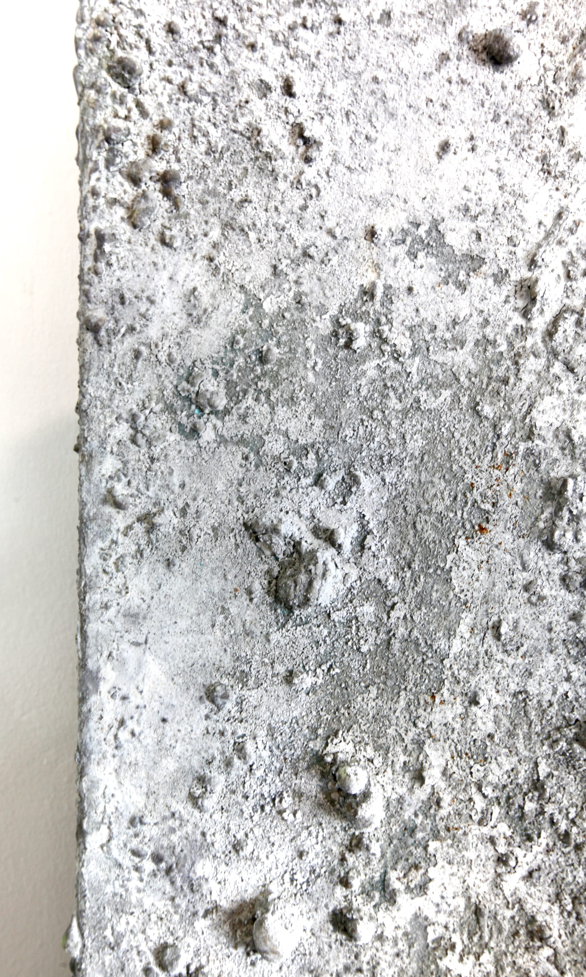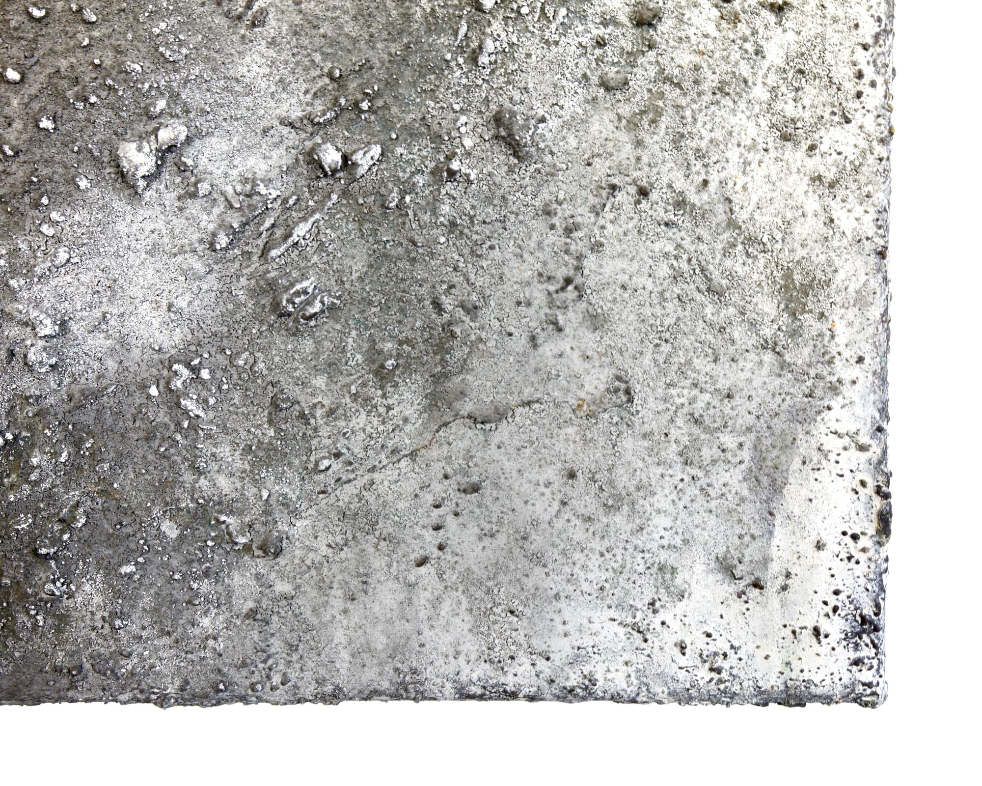 Overfladen bærer spor af den proces; lag af rust og patina, der har udviklet sig gennem oxidation og kemiske reaktioner; dernæst dækket af tynde lag indfarvet cement. Den oprindelige cirkelform ligger som en ghosting i kompositionen, delvist opløst af de naturlige nedbrydningsprocesser, tilføjet uforudsigelige teksturer og relieffekt.