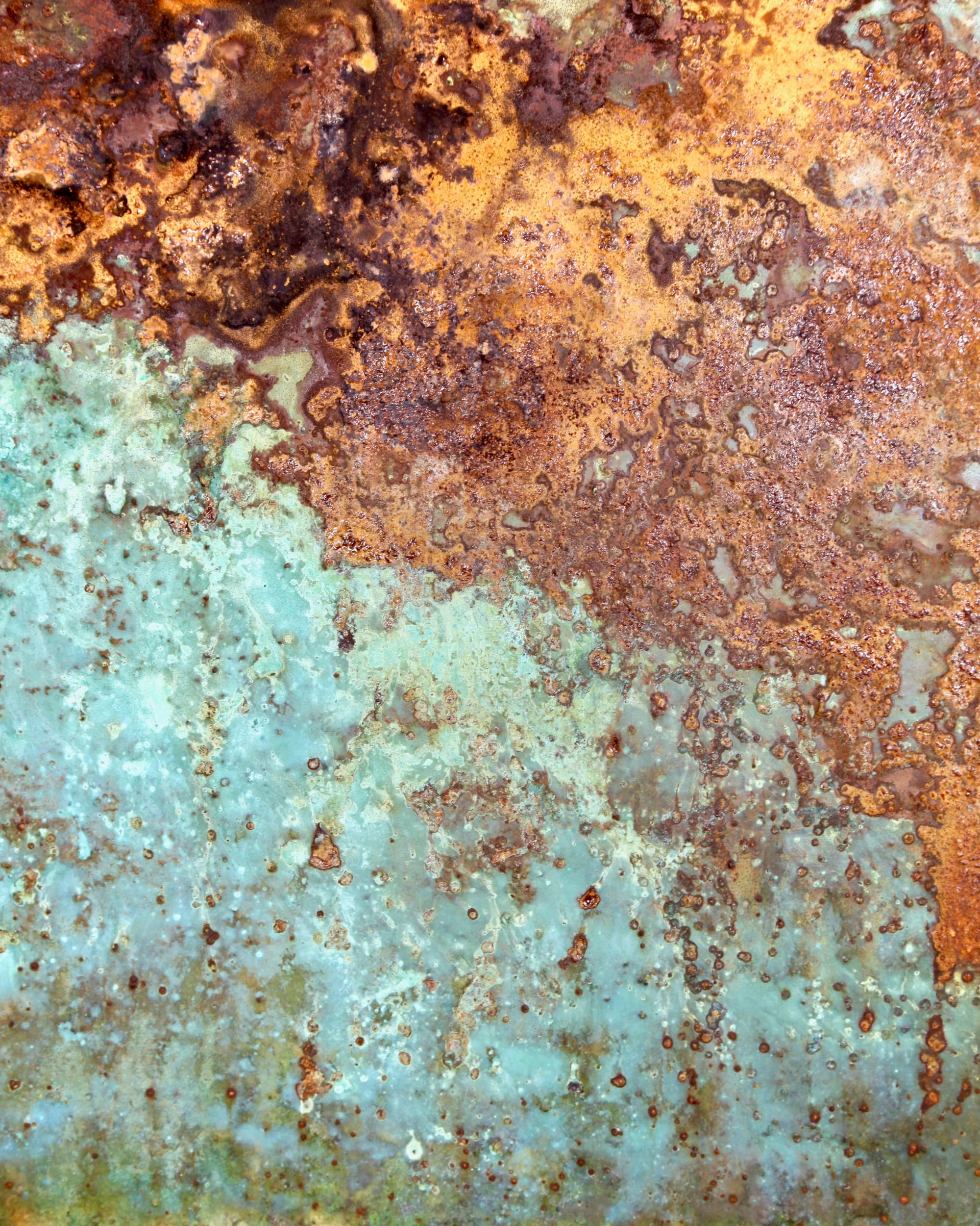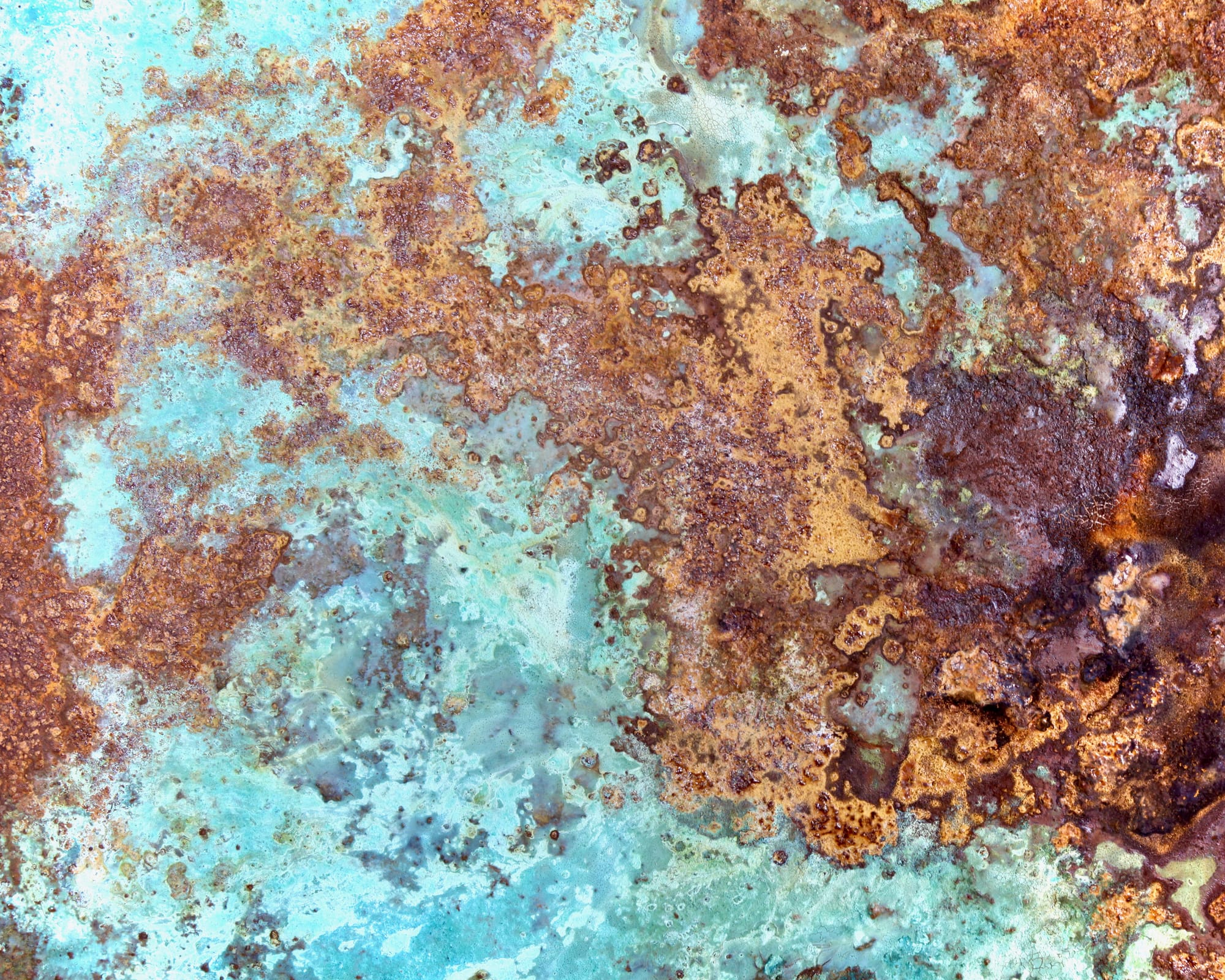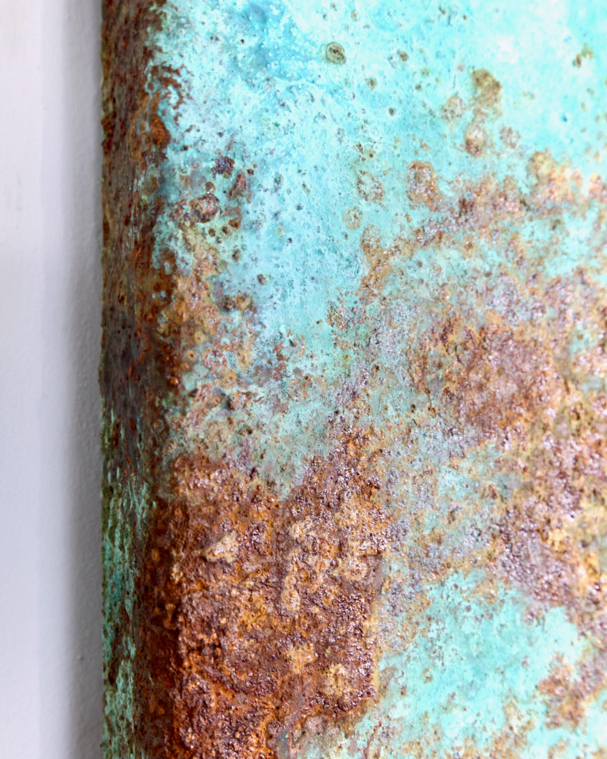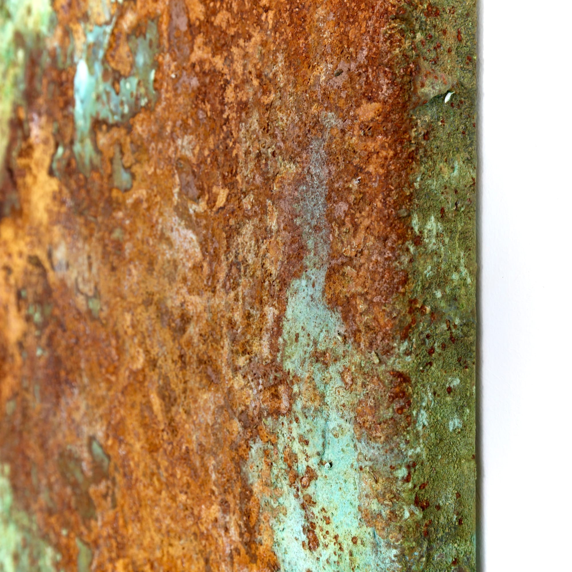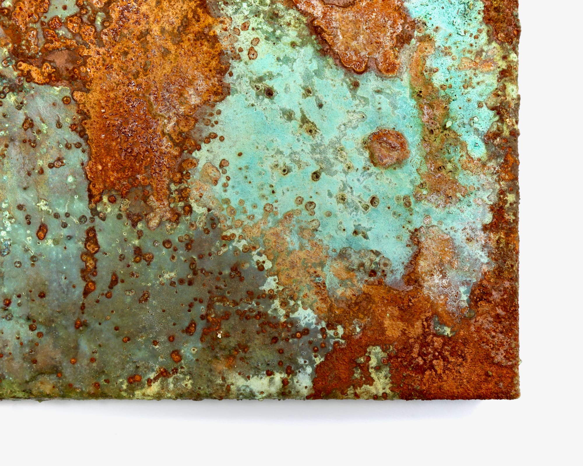 Oxidationen skaber i værket her organiske, næsten geografiske mønstre. Og jeg ér gået hårdt til den med både kemi og mekanik, for at fremprovokere de mest heftige irringer og rustudtrækninger jeg har kunnet på lærredet.