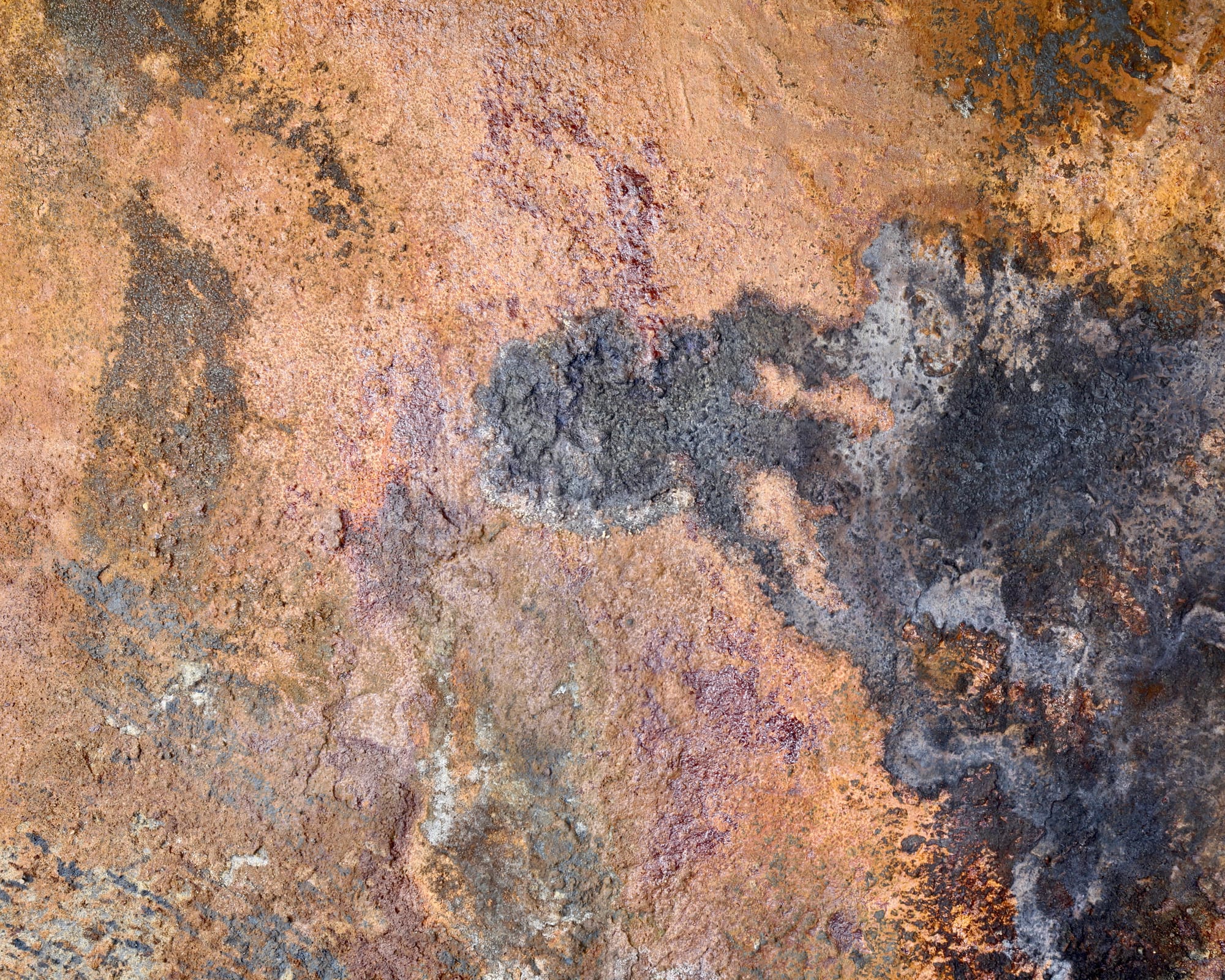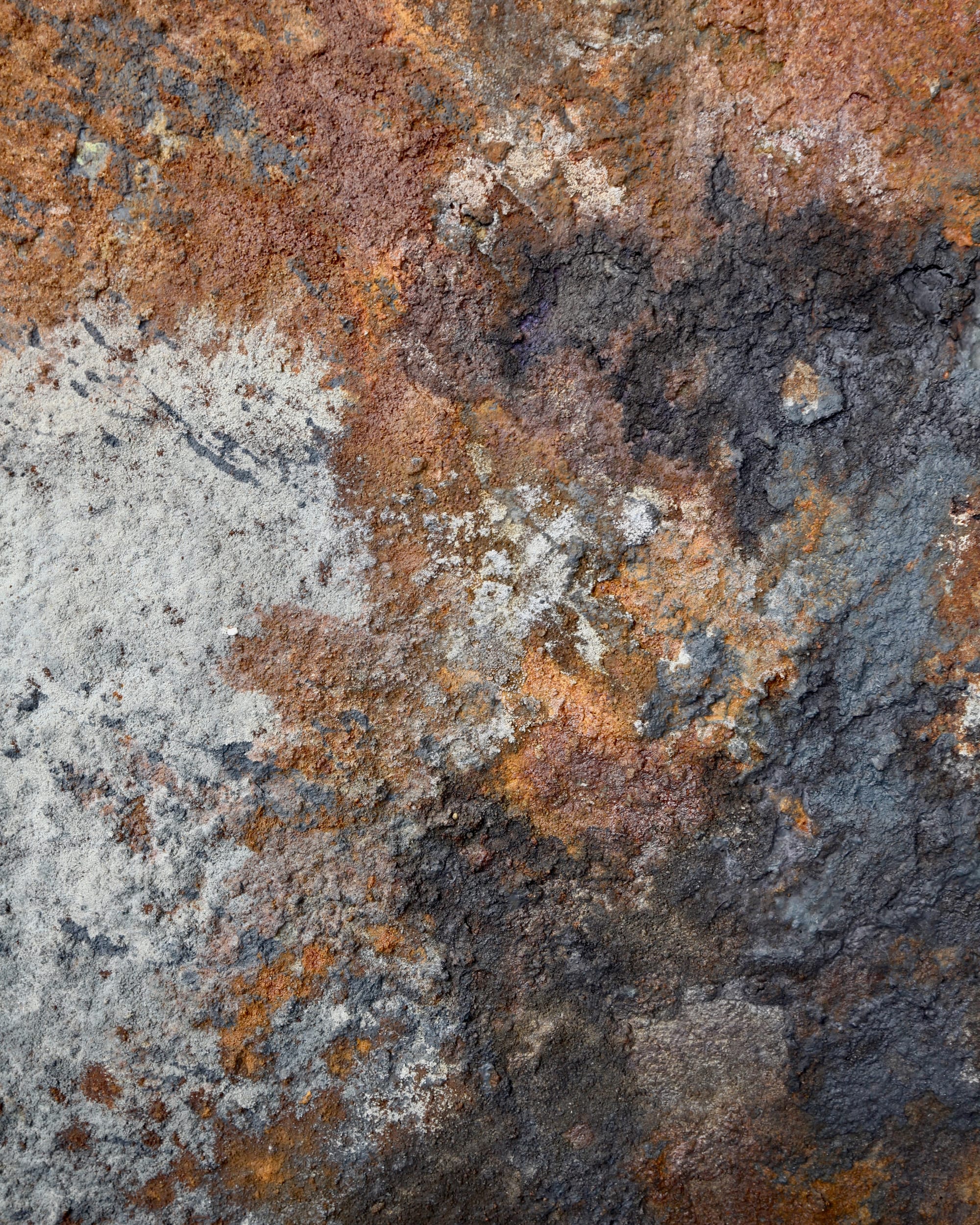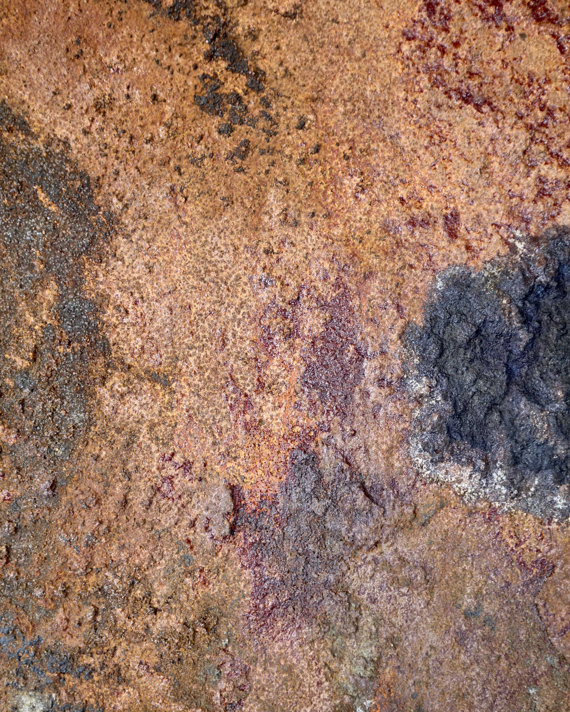 Særlig bemærkelsesværdig er måske kontrasten mellem de lysere, næsten sølvagtige områder og de dybe rustrøde partier. Enkelte steder ses også mørke løbespor, som understøtter fornemmelsen af en naturlig nedbrydningsproces.