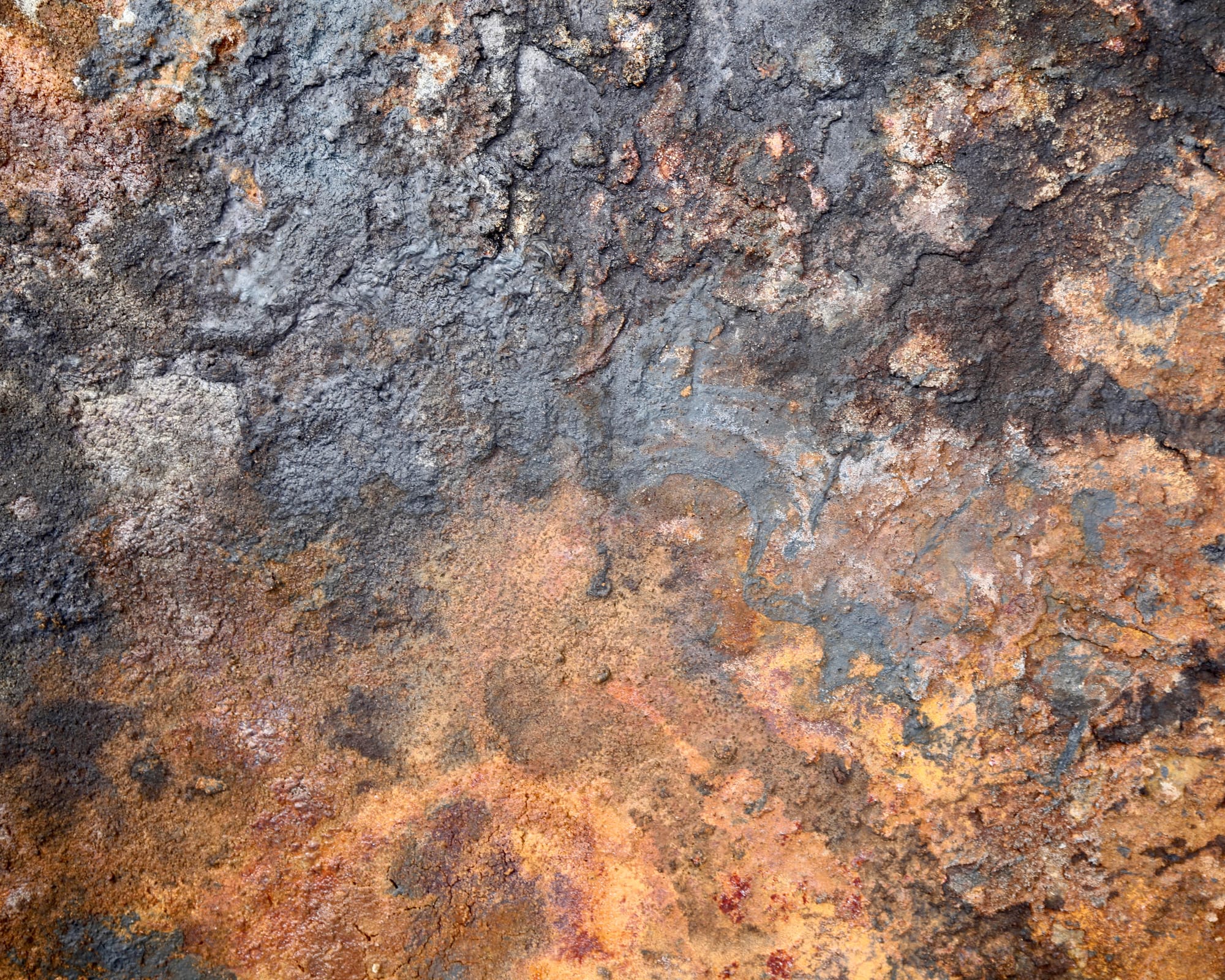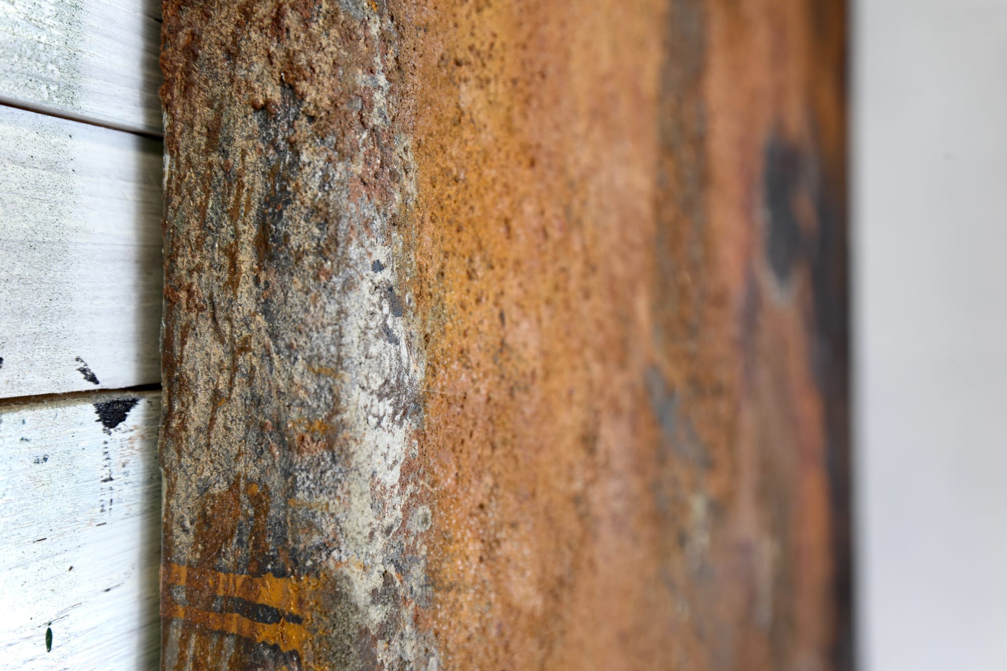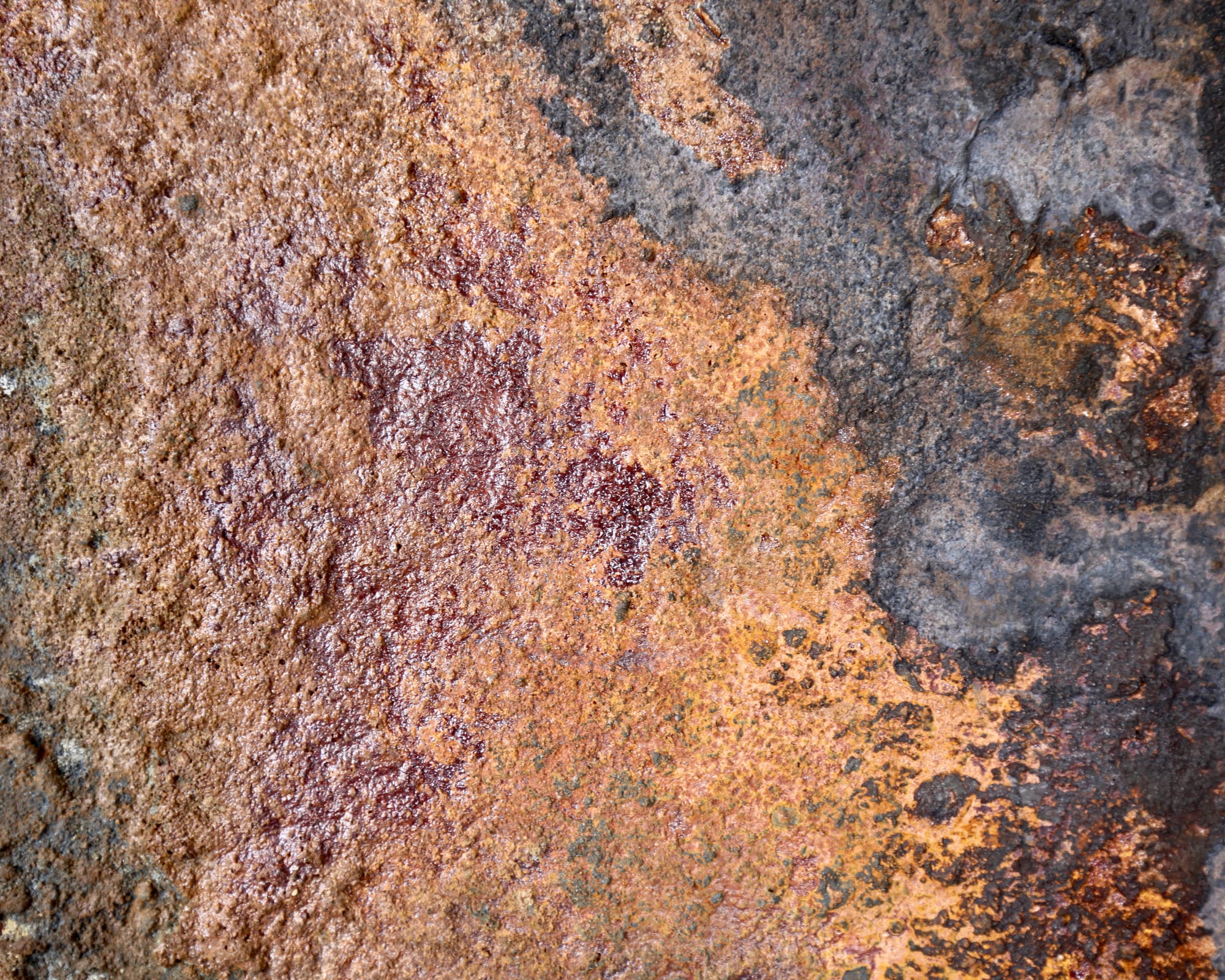Særlig bemærkelsesværdig er måske kontrasten mellem de lysere, næsten sølvagtige områder og de dybe rustrøde partier. Enkelte steder ses også mørke løbespor, som understøtter fornemmelsen af en naturlig nedbrydningsproces.
