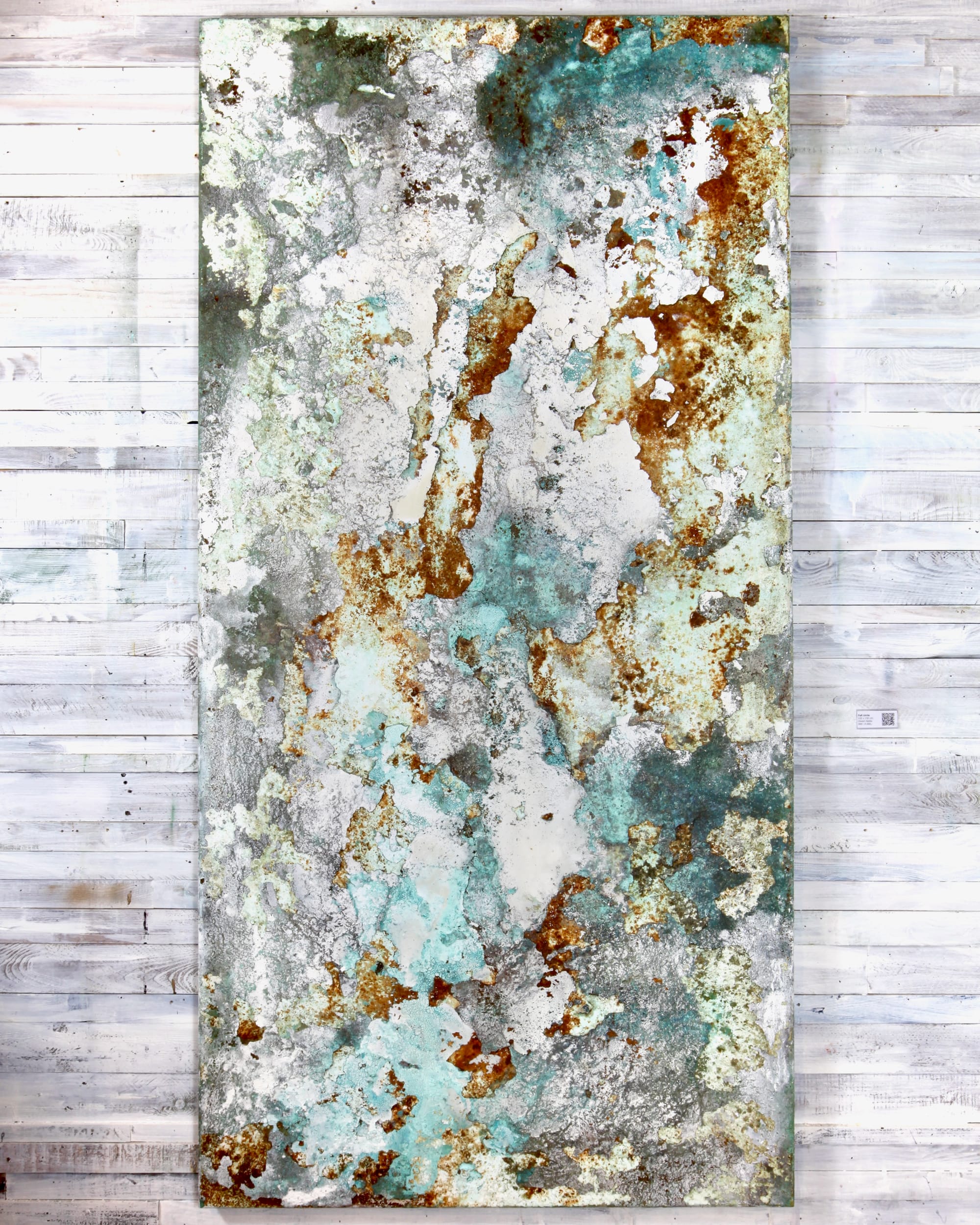 Farverne er kurateret tæt: holdt i de nuancer der naturligt opstår, når metal oxiderer og forvitrer under forskellige forhold. Selvom overfladen er kaotisk og organisk, giver det alligevel en underliggende harmoni.
