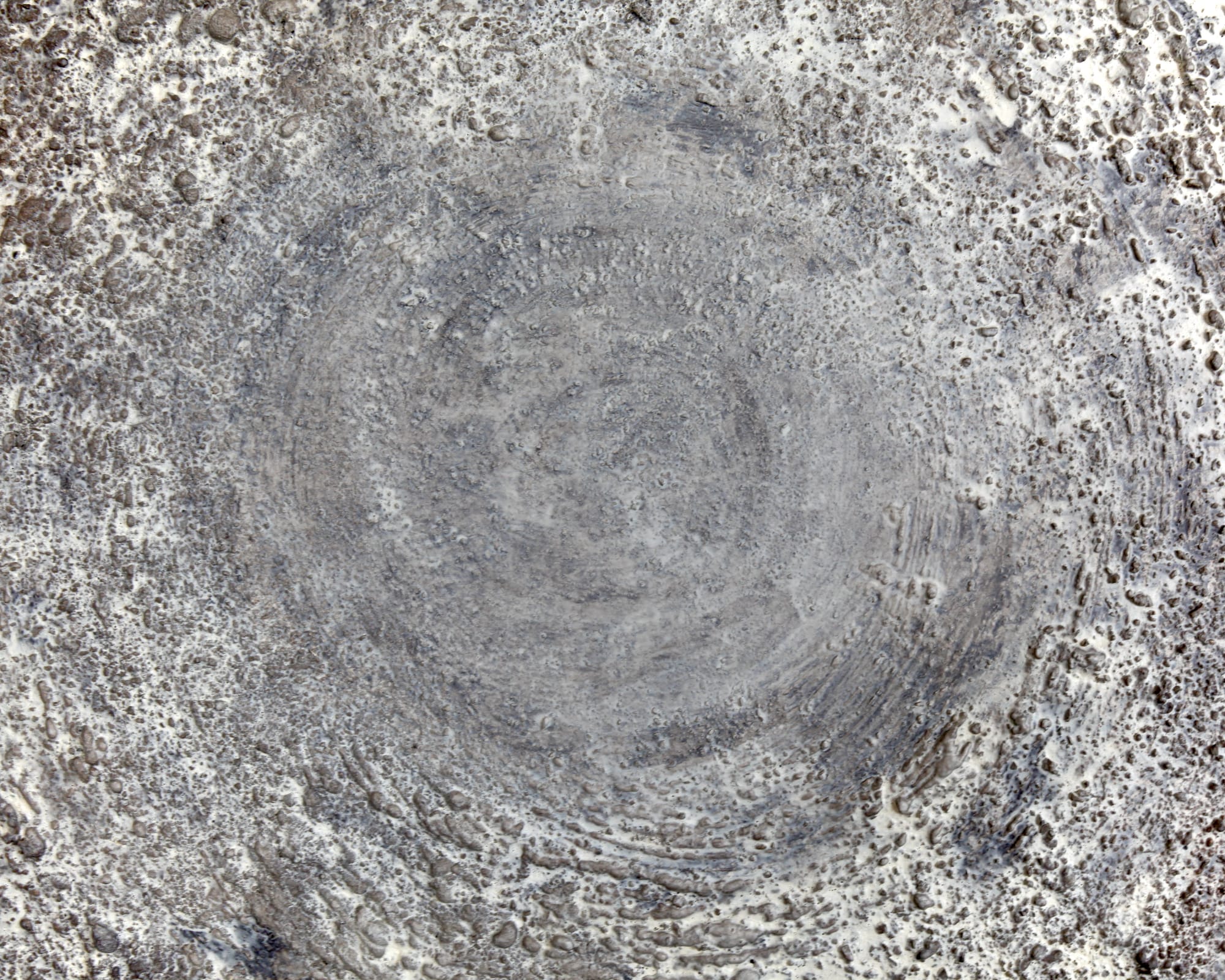 Overfladen er fyldt med cirkulære bevægelser, der spiraler udad fra et mørkere centrum; som ringe i vand eller som geologiske lag, der langsomt er blevet afsat over årtusinder. De bølgende teksturer skaber en hypnotisk rytme, nærmest som fingeraftryk af selve bevægelsen.