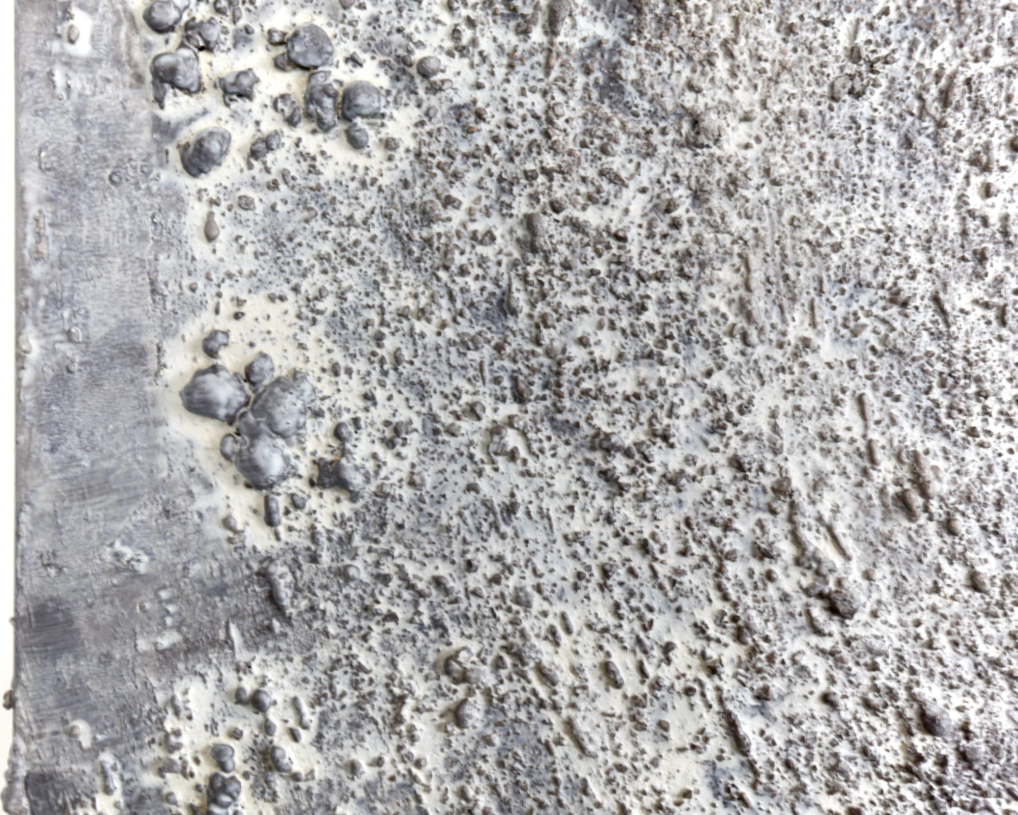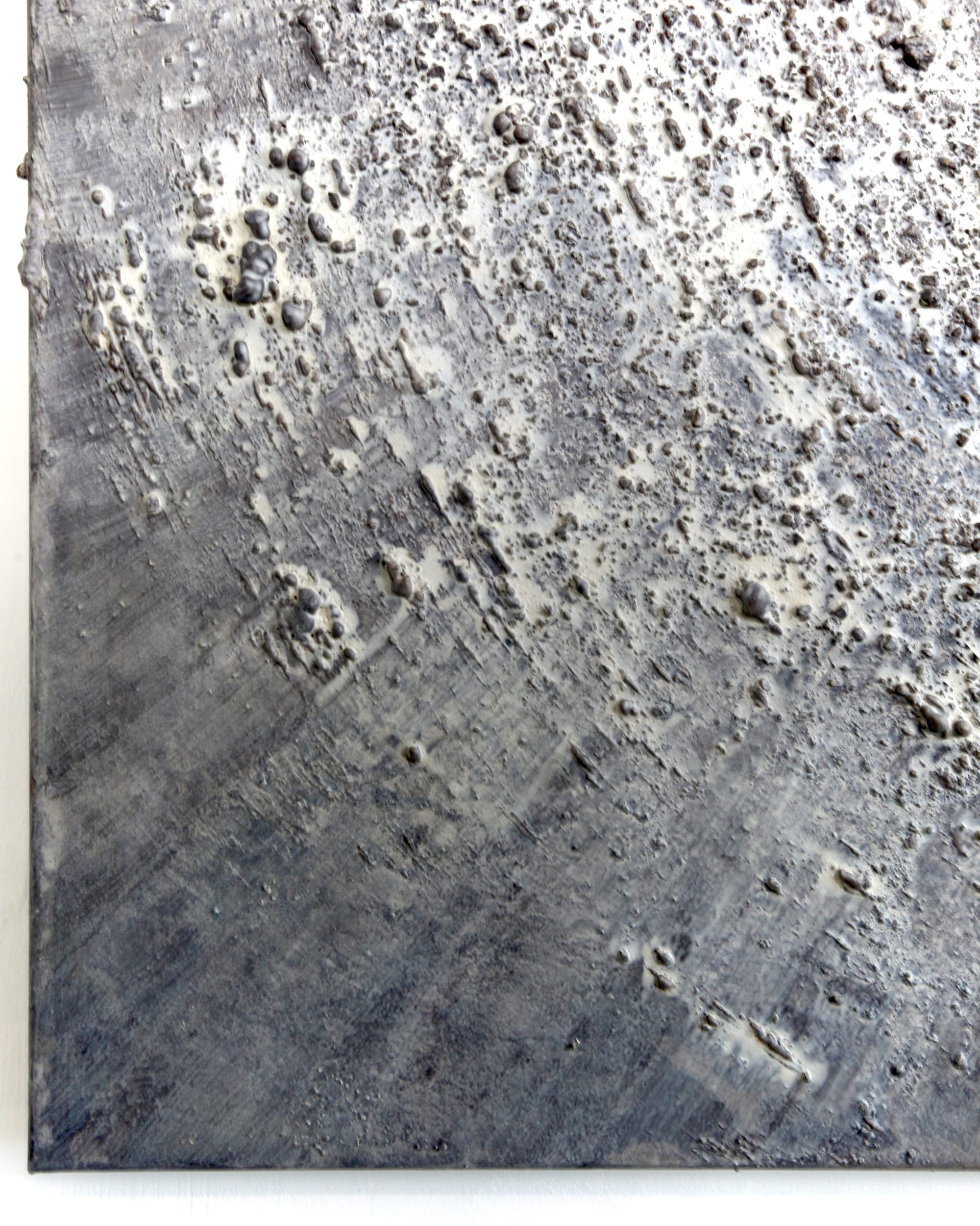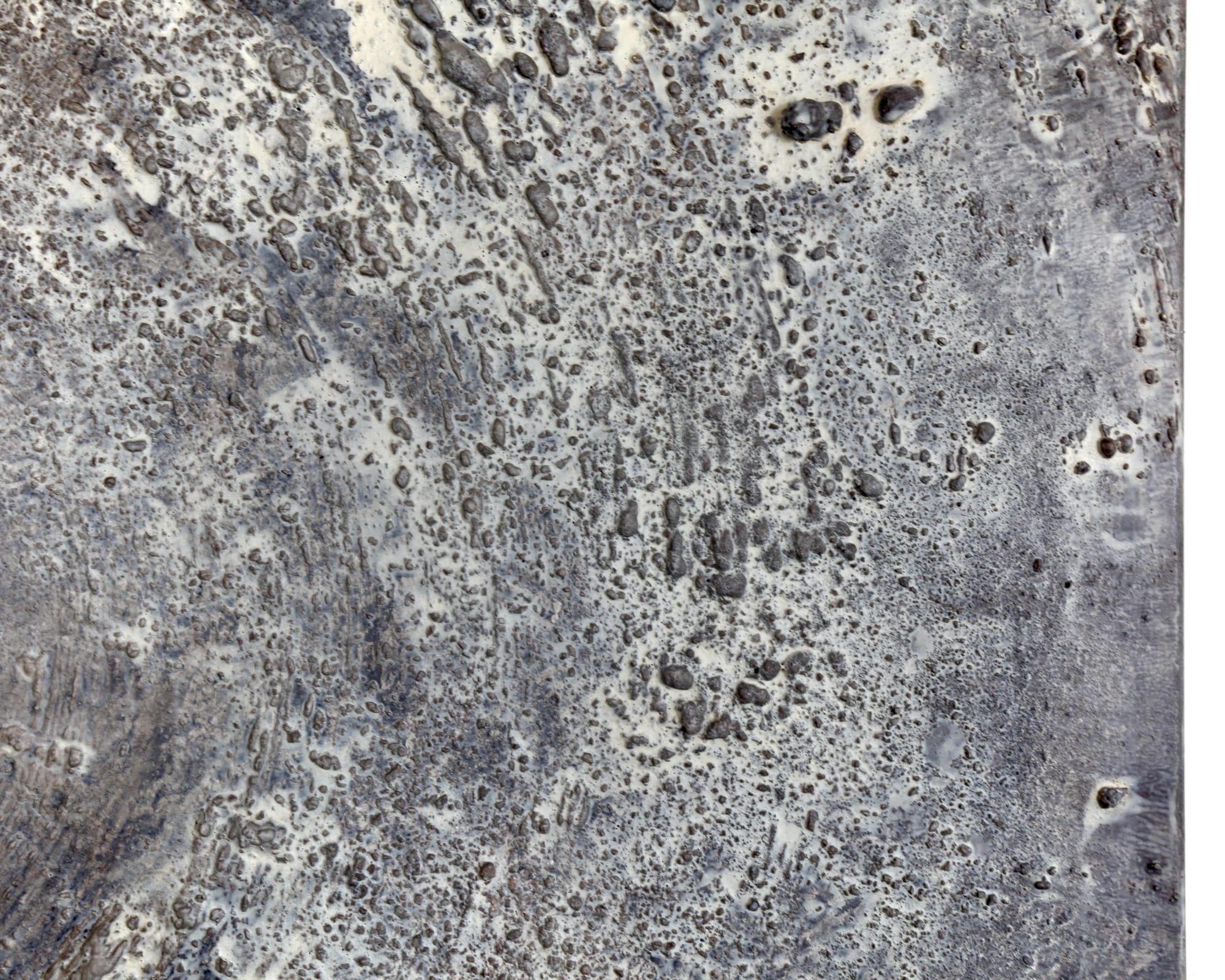 Farverne holder sig i kølige, metalliske toner: stål- og cementgrå, og hvidt, gennembrudt af spredte pletter af sepia, der bryder den monokrome ro. Lyset fanger de ophøjede partier og kaster skygger ned i de dybere fordybninger, så værket nærmest ånder.