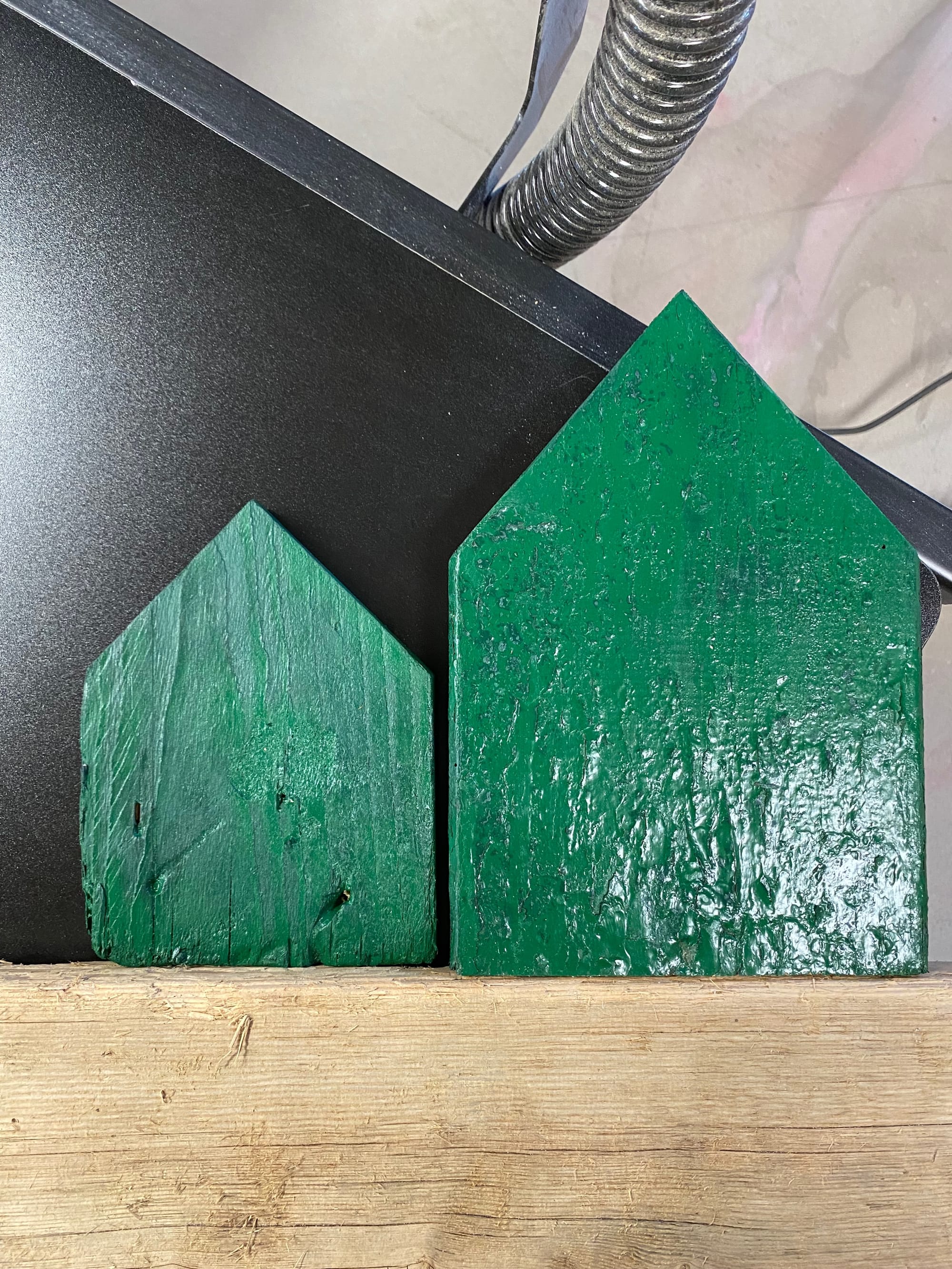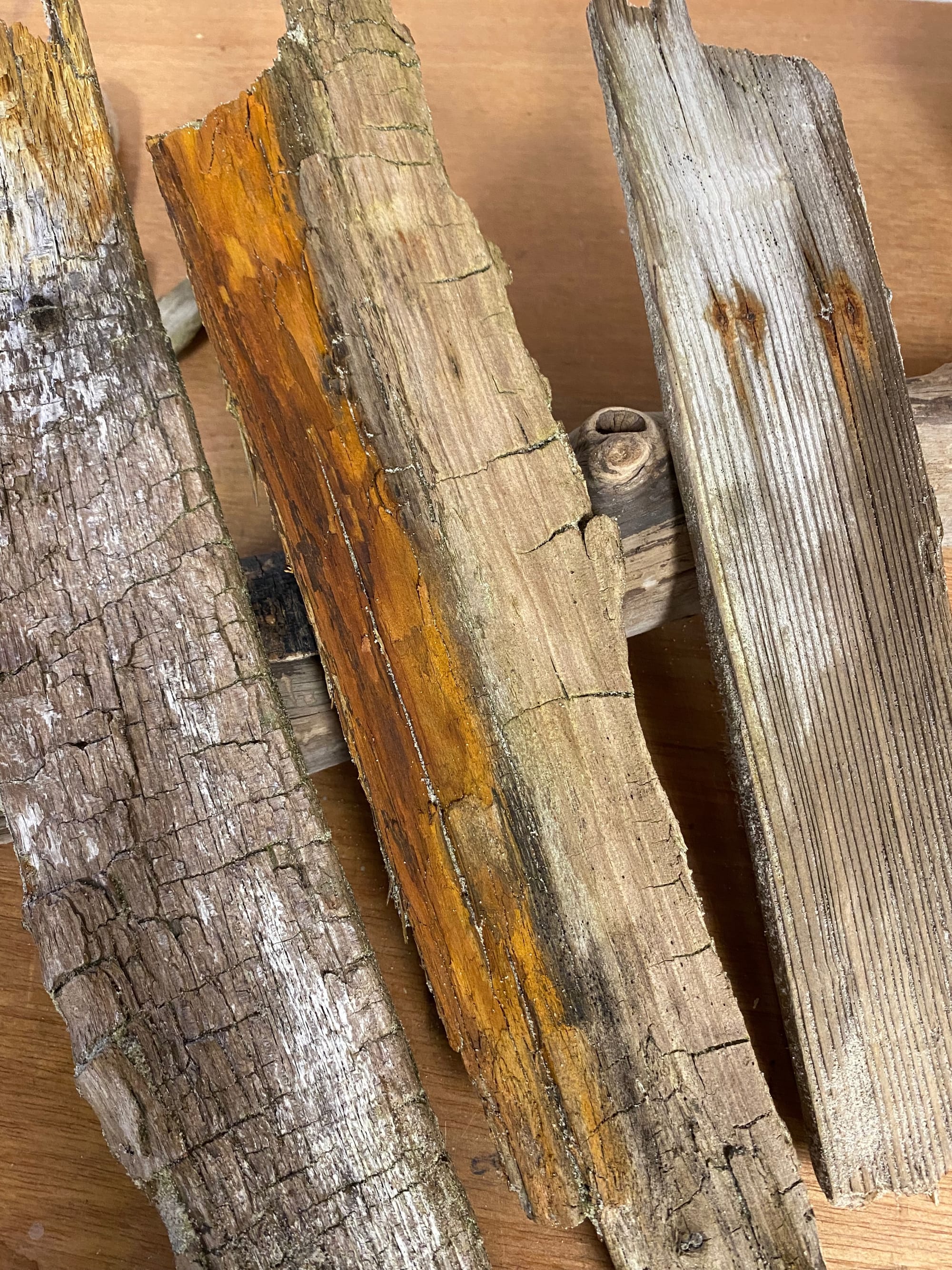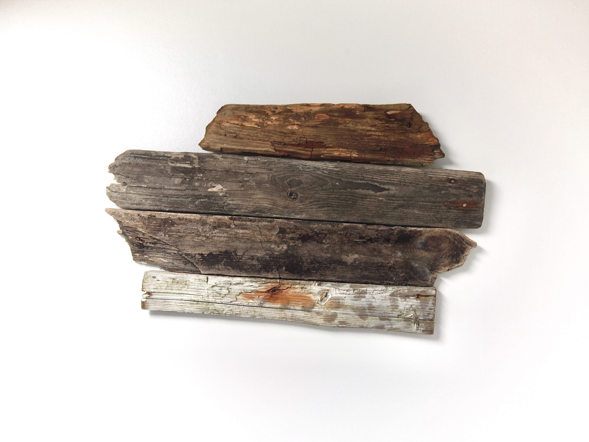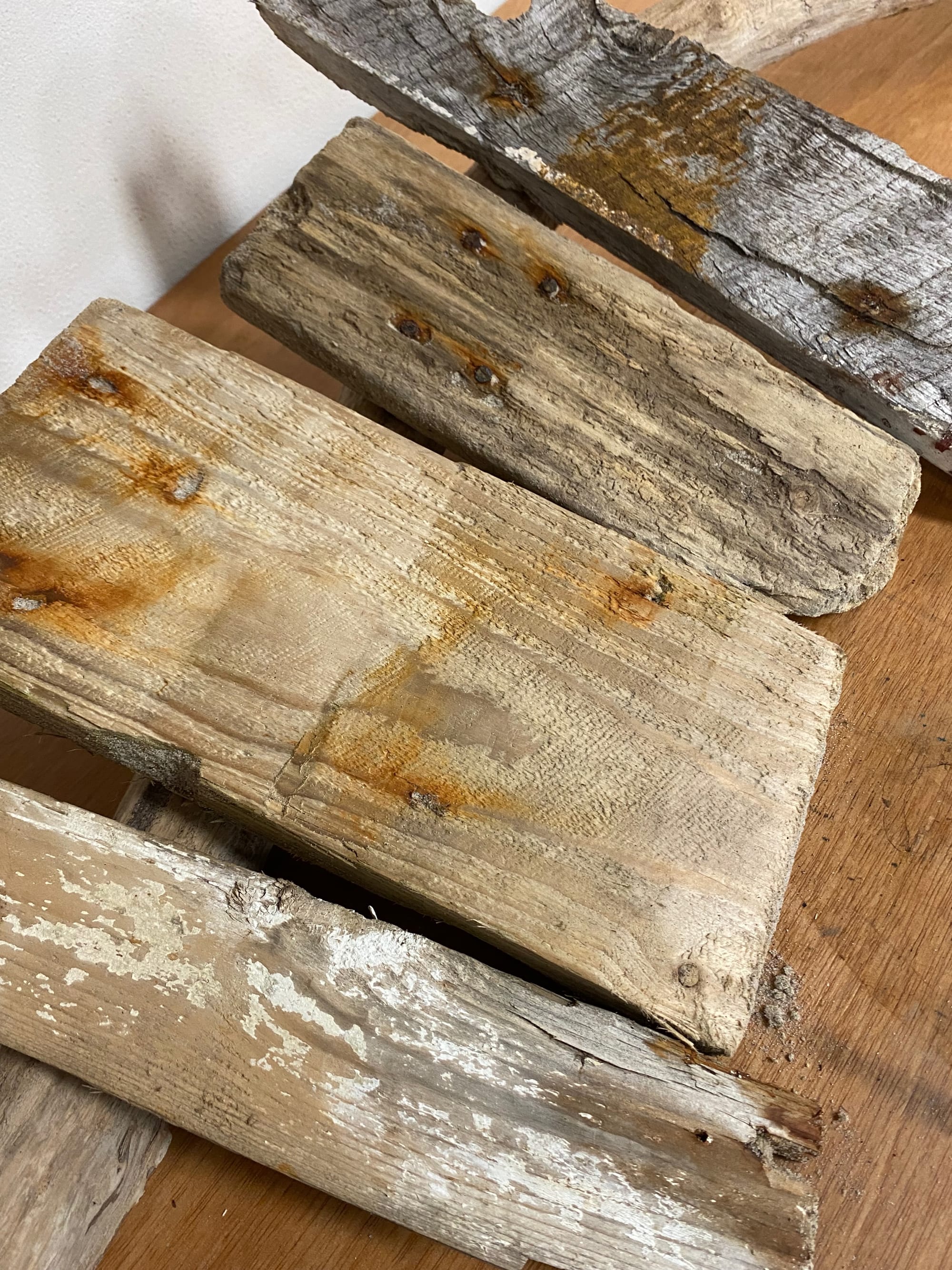 Det handler ikke bare om at have noget pænt at kigge på. Stumperne hér af gamle paller, planker og træer både bærer alle mærkerne af en lang rejse. Flere af stykkerne har rustfarvede striber og pletter—orange, rødbrun, brunrød—der er er løbet som akvarelmaling. Nogle få har spor af gammel turkis eller mintgrøn maling, blækket af tidens tand. En skøn patina, der virkelig har noget sjæl.