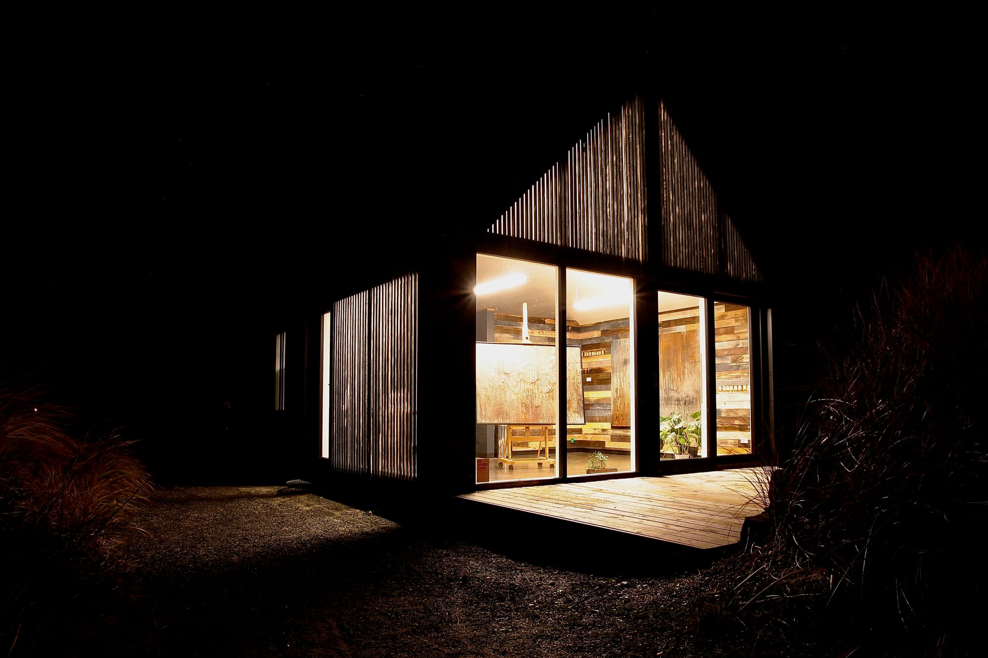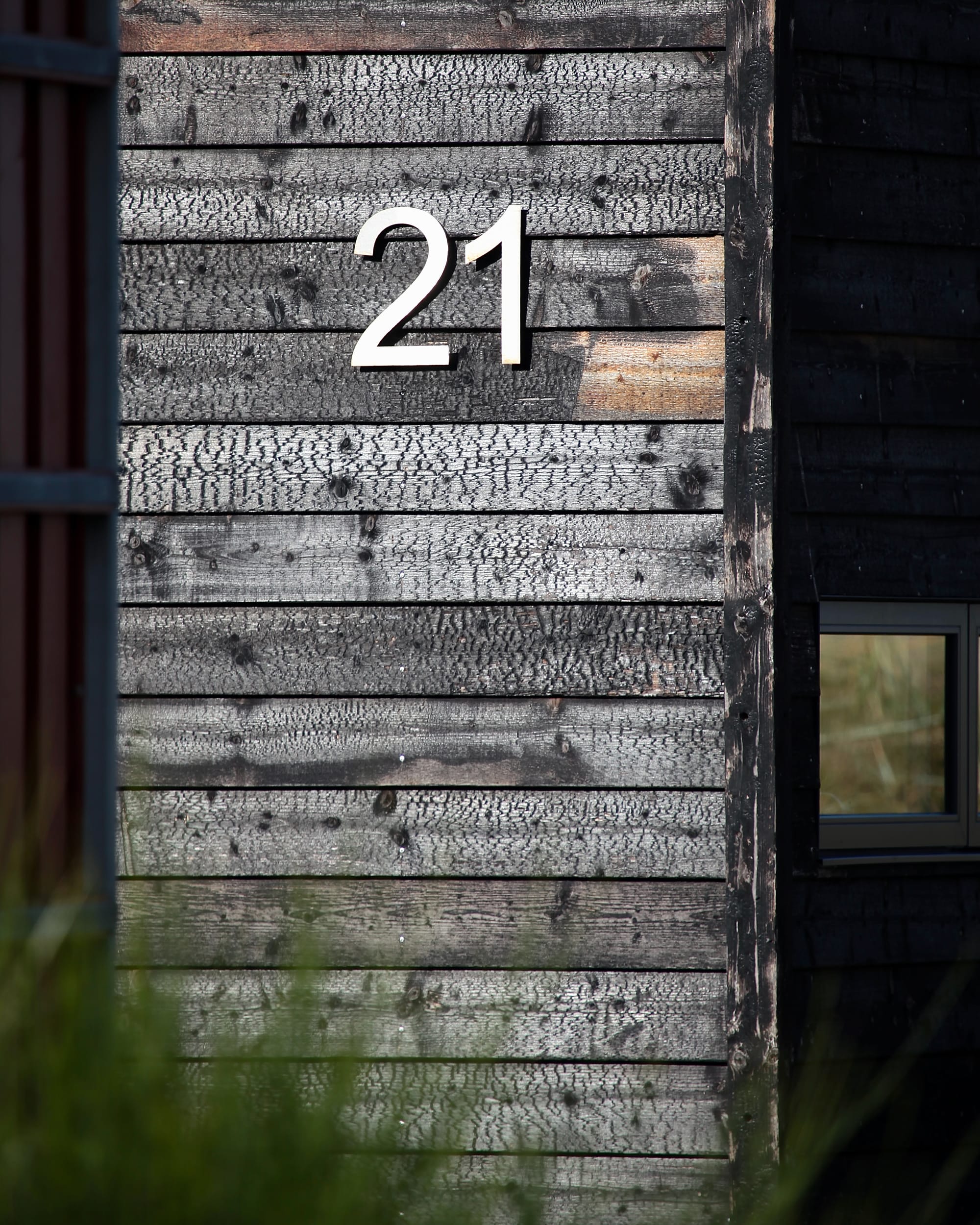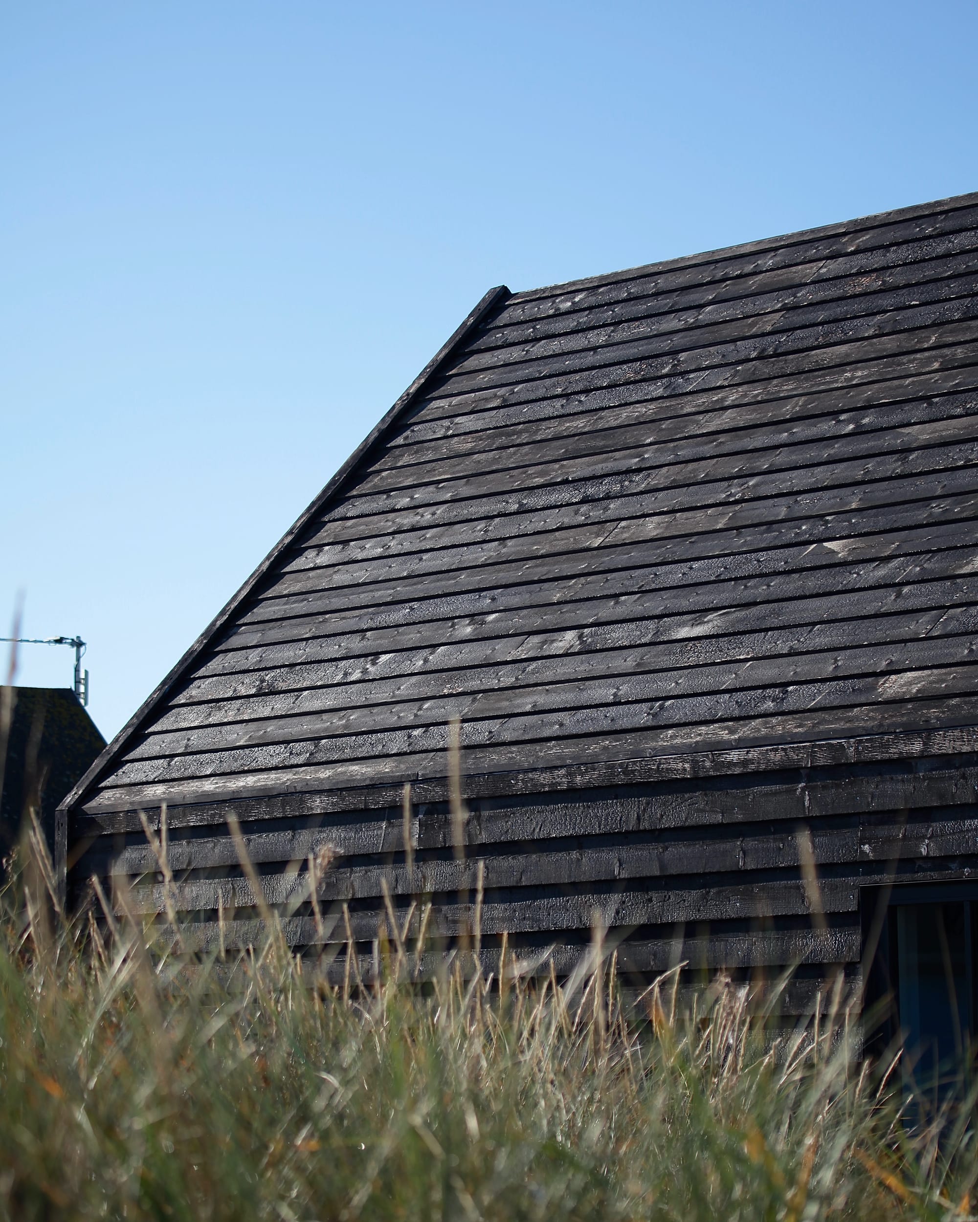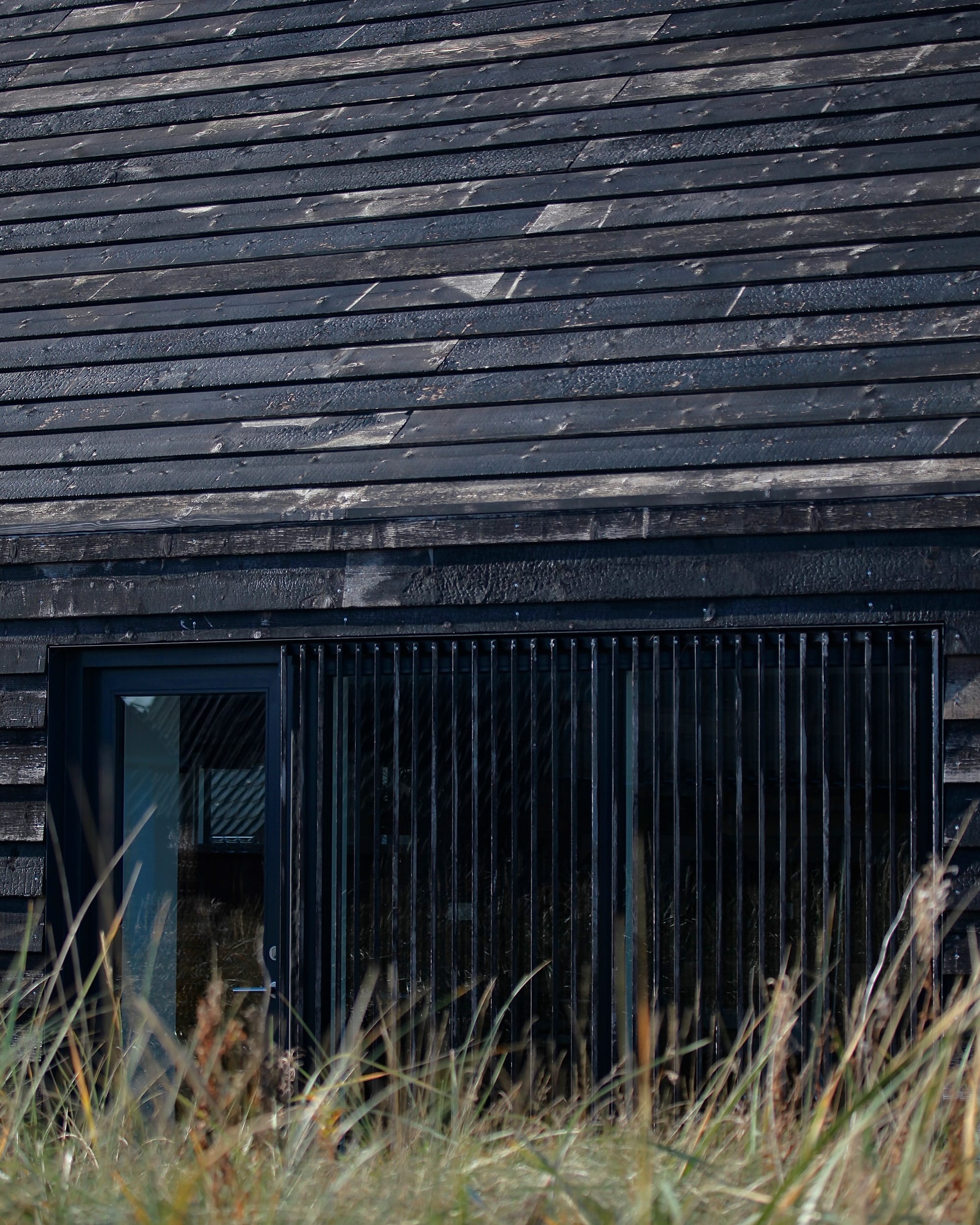 Både facade og tag er beklædt med brædder af dansk douglasgran, brændt i den klassiske japanske shou sugi ban-teknik; en århundreder gammel metode, hvor træet forkulles kontrolleret for at gøre det ekstremt vejrbestandigt, og modstandsdygtigt overfor råd og svamp.