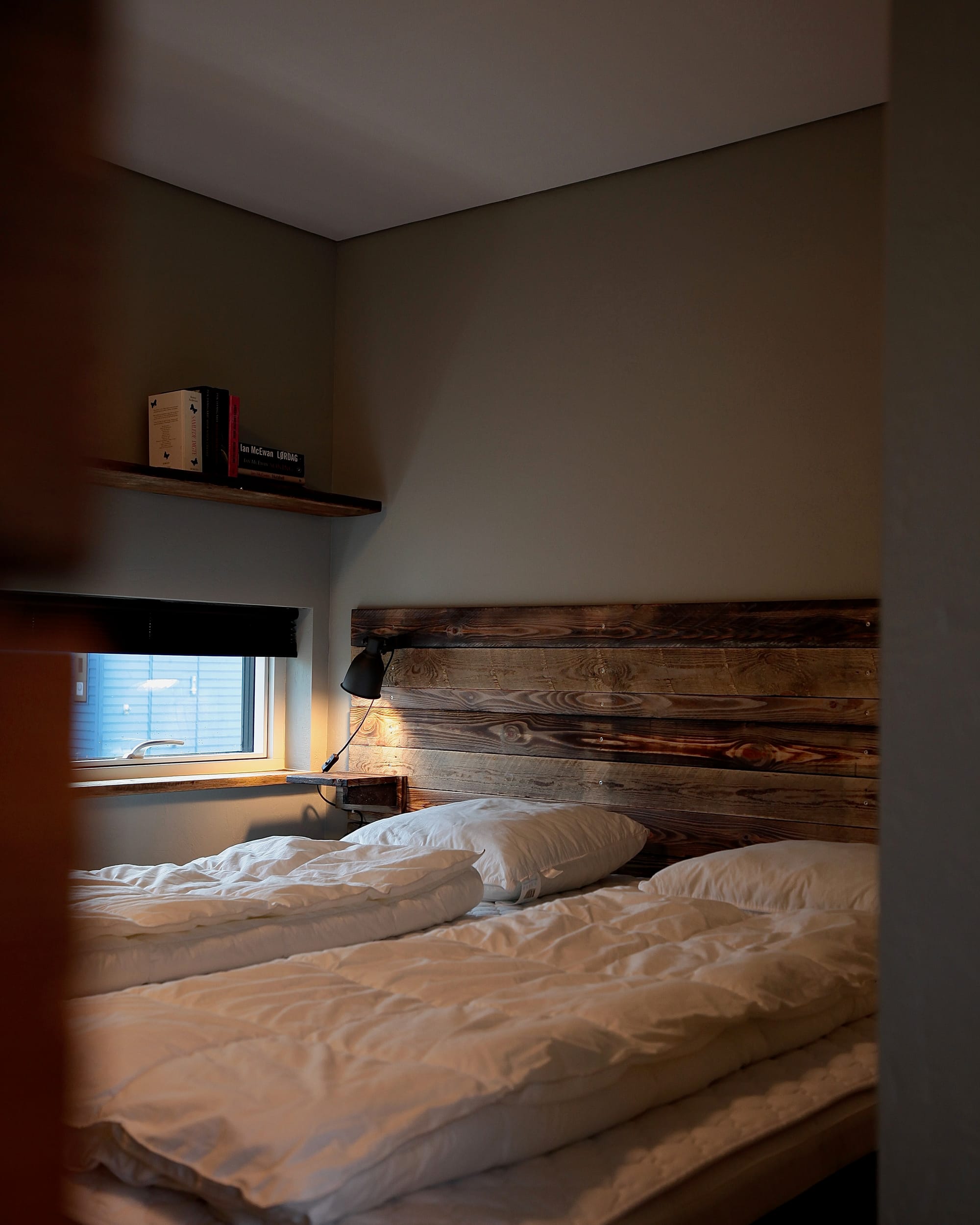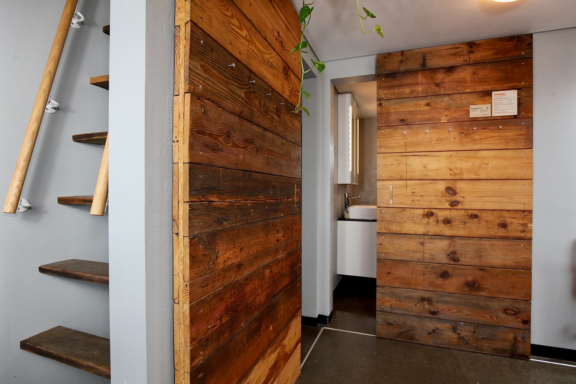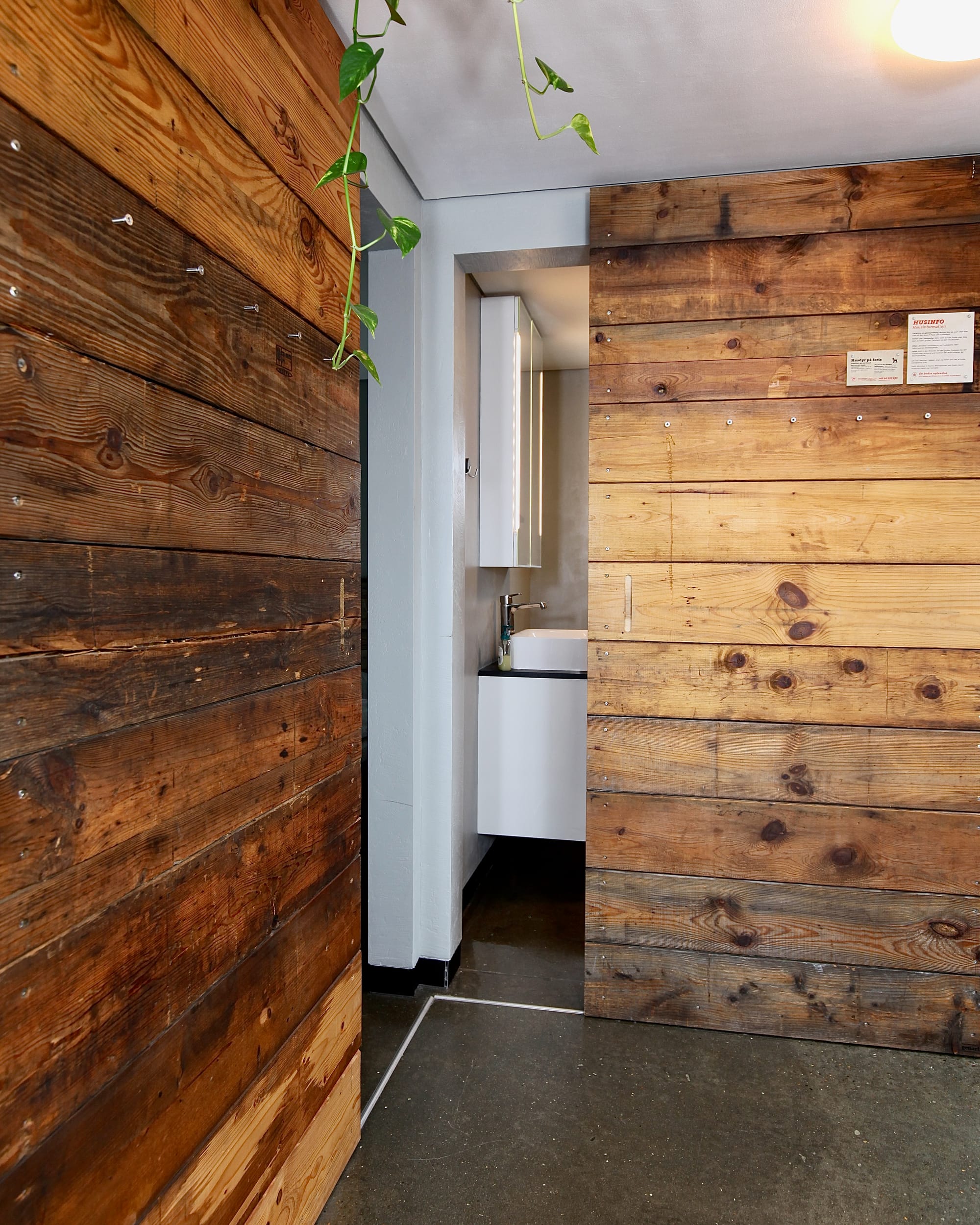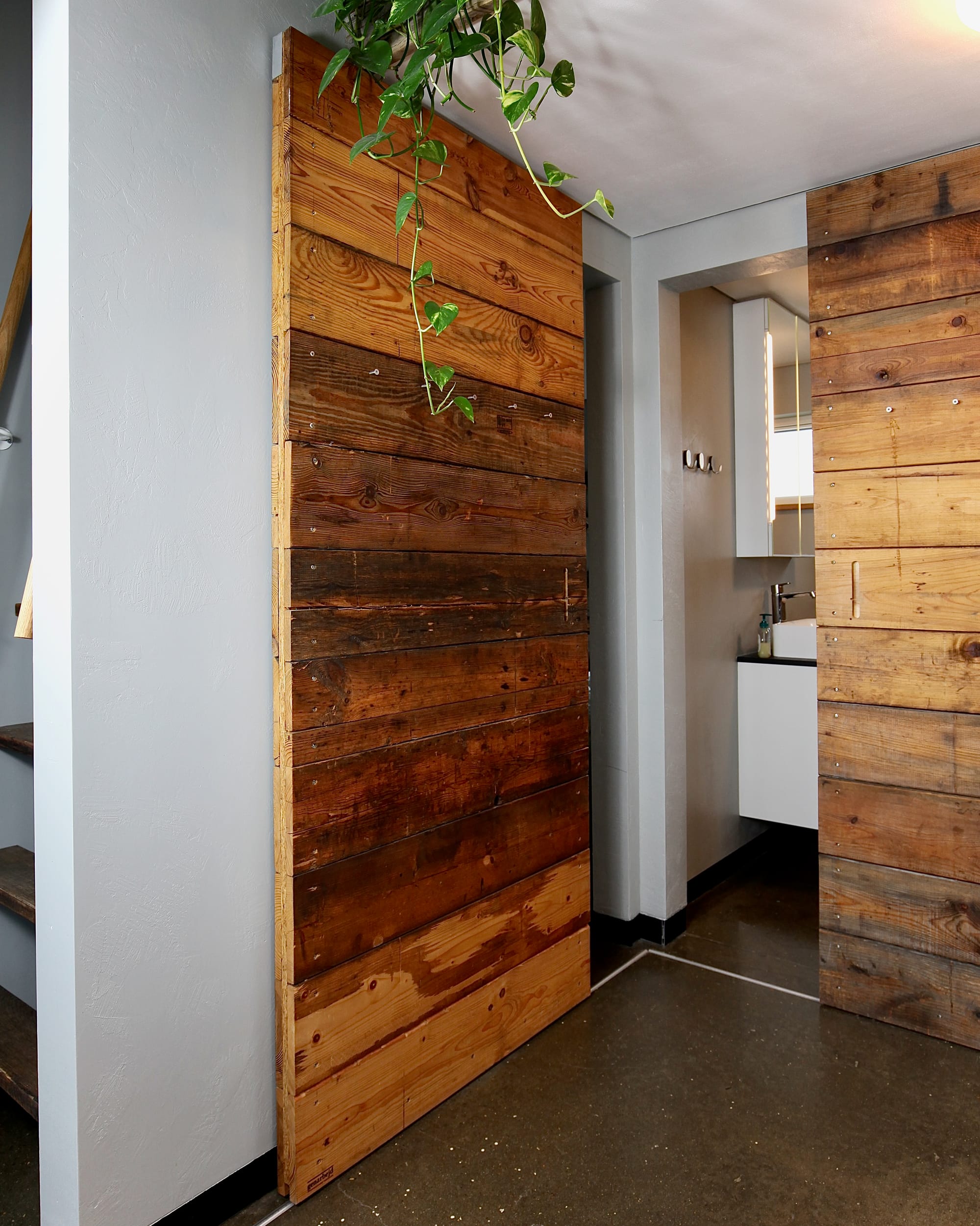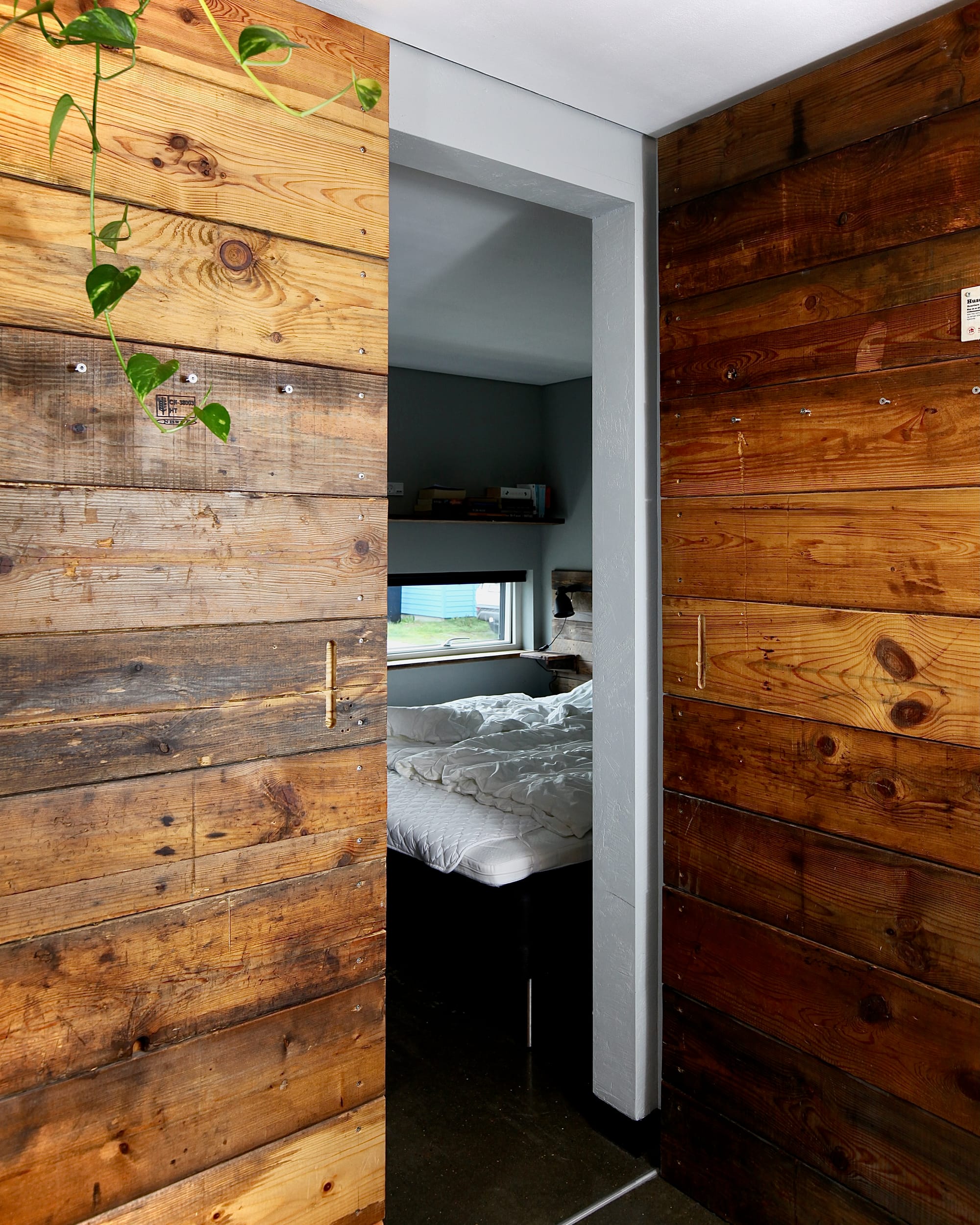 Inde i huset fortsætter filosofien: skydedøre af gamle pallerammer, vindueskarme og trappetrin af genanvendt egetræ, sengegavl og featurevæg i atelieret lavet af gammelt emballagetræ fra Hvide Sande Shipyard. Små, anderledes detaljer, der giver huset sjæl.